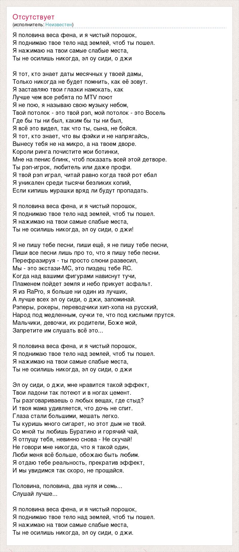 Я половина веса фена, и я чистый порошок, Я поднимаю твое тело над землей, чтоб ты пошел. Я нажимаю на твои самые слабые места, Ты не осилишь никогда, эл оу сиди, о джи Я тот, кто знает даты месячных у твоей дамы, Только никогда не будет помнить, как её зовут. Я заставляю твои глазки намокать, как Лучше чем все ребята по MTV поют Я не пою, я называю свою музыку небом, Твой потолок - это твой рэп, мой потолок - это Восель Где бы ты ни был, каким бы ты ни был, Я всё это видел, так что ты, сына, не бойся. Я тот, кто знает, что вы фэйки и не напрягайсь, Вынесу тебя не на микро, а на твоем дворе. Короли ринга почистите мои ботинки, Мне на пенис блинк, чтоб показать всей этой детворе. Ты рэп-игрок, любитель или даже профи. Я твой рэп играл, читай равно когда твой рот ебал Я уникален среди тысячи безликих копий, Если кипишь мурашки вряд ли будут пропадать. Я половина веса фена, и я чистый порошок, Я поднимаю твое тело над землей, чтоб ты пошел. Я нажимаю на твои самые слабые места, Ты не осилишь никогда, эл оу сиди, о джи! Я не пишу тебе песни, пиши ещё, я не пишу тебе песни, Пиши все песни лишь про то, что я пишу тебе песни. Перефразируя - ты просто слюни развесил, Мы - это экстази-МС, это пиздец тебе RС. Когда над вашими фигурами нависнут тучи, Пламенем пойдет земля и небо прикует асфальт. Я из RaPro, я больше ни один из лучших, А лучше всех эл оу сиди, о джи, запоминай. Рэперы, рокеры, переводчики хип-хопа на русский, Народ под медленным, сучки те, что под кислыми прутся. Мальчики, девочки, их родители, Боже мой, Запретите им слушать всё это... Я половина веса фена, и я чистый порошок, Я поднимаю твое тело над землей, чтоб ты пошел. Я нажимаю на твои самые слабые места, Ты не осилишь никогда, эл оу сиди, о джи Эл оу сиди, о джи, мне нравится такой эффект, Твои ладони так потеют и в ногах цемент. Ты разговариваешь о любых вещах, где стыд? И твоя мама удивляется, что дочь не спит. Глаза стали большими, мешать легко. Ты куришь много сигарет, но этот дым не твой. Со мной ты любишь Буратино и горячий чай, Я отпущу тебя, невинно снова - Не скучай! Не говори мне никогда, что я такой один, Люби меня всё больше, обожаю быть любим. Я отдаю тебе реальность, прекратив эффект, И мы увидимся так скоро, не прощайся. Половина, половина, два нуля и семь... Слушай лучше... Я половина веса фена, и я чистый порошок, Я поднимаю твое тело над землей, чтоб ты пошел. Я нажимаю на твои самые слабые места, Ты не осилишь никогда, эл оу сиди, о джи.