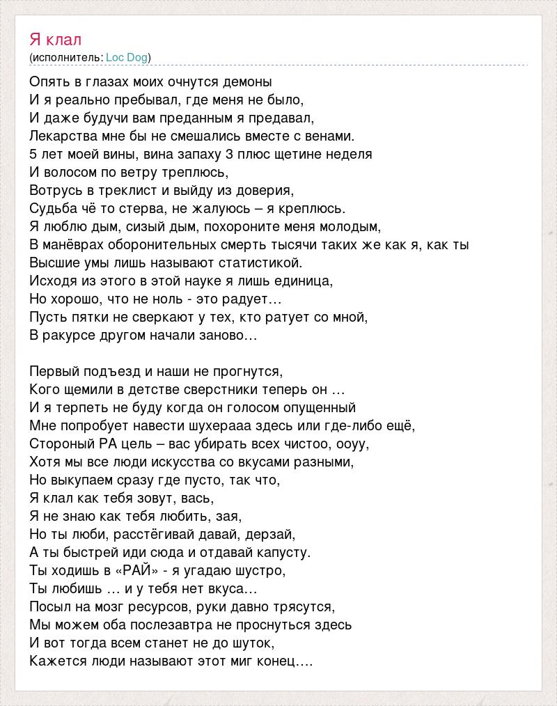 Опять в глазах моих очнутся демоны И я реально пребывал, где меня не было, И даже будучи вам преданным я предавал, Лекарства мне бы не смешались вместе с венами. 5 лет моей вины, вина запаху 3 плюс щетине неделя И волосом по ветру треплюсь, Вотрусь в треклист и выйду из доверия, Судьба чё то стерва, не жалуюсь – я креплюсь. Я люблю дым, сизый дым, похороните меня молодым, В манёврах оборонительных смерть тысячи таких же как я, как ты Высшие умы лишь называют статистикой. Исходя из этого в этой науке я лишь единица, Но хорошо, что не ноль - это радует… Пусть пятки не сверкают у тех, кто ратует со мной, В ракурсе другом начали заново… Первый подъезд и наши не прогнутся, Кого щемили в детстве сверстники теперь он … И я терпеть не буду когда он голосом опущенный Мне попробует навести шухерааа здесь или где-либо ещё, Стороный РА цель – вас убирать всех чистоо, ооуу, Хотя мы все люди искусства со вкусами разными, Но выкупаем сразу где пусто, так что, Я клал как тебя зовут, вась, Я не знаю как тебя любить, зая, Но ты люби, расстёгивай давай, дерзай, А ты быстрей иди сюда и отдавай капусту. Ты ходишь в «РАЙ» - я угадаю шустро, Ты любишь … и у тебя нет вкуса… Посыл на мозг ресурсов, руки давно трясутся, Мы можем оба послезавтра не проснуться здесь И вот тогда всем станет не до шуток, Кажется люди называют этот миг конец….