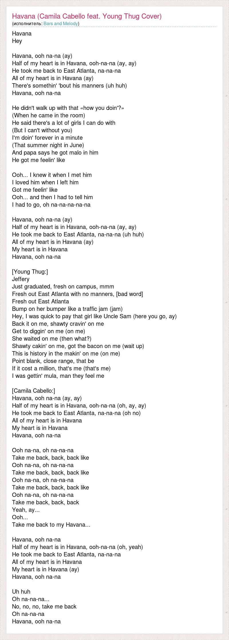 Havana Hey Havana, ooh na-na (ay) Half of my heart is in Havana, ooh-na-na (ay, ay) He took me back to East Atlanta, na-na-na All of my heart is in Havana (ay) There's somethin' 'bout his manners (uh huh) Havana, ooh na-na He didn't walk up with that «how you doin'?» (When he came in the room) He said there's a lot of girls I can do with (But I can't without you) I'm doin' forever in a minute (That summer night in June) And papa says he got malo in him He got me feelin' like Ooh... I knew it when I met him I loved him when I left him Got me feelin' like Ooh... and then I had to tell him I had to go, oh na-na-na-na-na Havana, ooh na-na (ay) Half of my heart is in Havana, ooh-na-na (ay, ay) He took me back to East Atlanta, na-na-na (uh huh) All of my heart is in Havana (ay) My heart is in Havana Havana, ooh na-na [Young Thug:] Jeffery Just graduated, fresh on campus, mmm Fresh out East Atlanta with no manners, [bad word] Fresh out East Atlanta Bump on her bumper like a traffic jam (jam) Hey, I was quick to pay that girl like Uncle Sam (here you go, ay) Back it on me, shawty cravin' on me Get to diggin' on me (on me) She waited on me (then what?) Shawty cakin' on me, got the bacon on me (wait up) This is history in the makin' on me (on me) Point blank, close range, that be If it cost a million, that's me (that's me) I was gettin' mula, man they feel me [Camila Cabello:] Havana, ooh na-na (ay, ay) Half of my heart is in Havana, ooh-na-na (oh, ay, ay) He took me back to East Atlanta, na-na-na (oh no) All of my heart is in Havana My heart is in Havana Havana, ooh na-na Ooh na-na, oh na-na-na Take me back, back, back like Ooh na-na, oh na-na-na Take me back, back, back like Ooh na-na, oh na-na-na Take me back, back, back like Ooh na-na, oh na-na-na Take me back, back, back Yeah, ay... Ooh... Take me back to my Havana... Havana, ooh na-na Half of my heart is in Havana, ooh-na-na (oh, yeah) He took me back to East Atlanta, na-na-na All of my heart is in Havana My heart is in Havana (ay) Havana, ooh na-na Uh huh Oh na-na-na... No, no, no, take me back Oh na-na-na Havana, ooh na-na