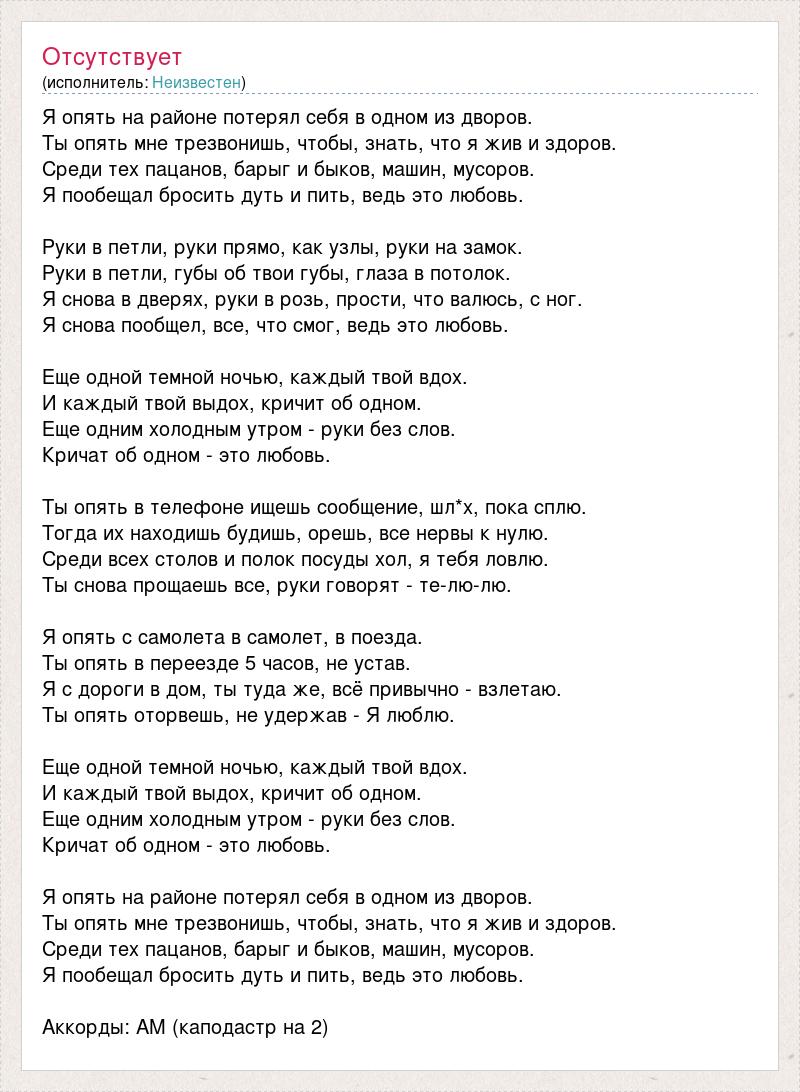 Я опять на районе потерял себя в одном из дворов. Ты опять мне трезвонишь, чтобы, знать, что я жив и здоров. Среди тех пацанов, барыг и быков, машин, мусоров. Я пообещал бросить дуть и пить, ведь это любовь. Руки в петли, руки прямо, как узлы, руки на замок. Руки в петли, губы об твои губы, глаза в потолок. Я снова в дверях, руки в розь, прости, что валюсь, с ног. Я снова пообщел, все, что смог, ведь это любовь. Еще одной темной ночью, каждый твой вдох. И каждый твой выдох, кричит об одном. Еще одним холодным утром - руки без слов. Кричат об одном - это любовь. Ты опять в телефоне ищешь сообщение, шл*х, пока сплю. Тогда их находишь будишь, орешь, все нервы к нулю. Среди всех столов и полок посуды хол, я тебя ловлю. Ты снова прощаешь все, руки говорят - те-лю-лю. Я опять с самолета в самолет, в поезда. Ты опять в переезде 5 часов, не устав. Я с дороги в дом, ты туда же, всё привычно - взлетаю. Ты опять оторвешь, не удержав - Я люблю. Еще одной темной ночью, каждый твой вдох. И каждый твой выдох, кричит об одном. Еще одним холодным утром - руки без слов. Кричат об одном - это любовь. Я опять на районе потерял себя в одном из дворов. Ты опять мне трезвонишь, чтобы, знать, что я жив и здоров. Среди тех пацанов, барыг и быков, машин, мусоров. Я пообещал бросить дуть и пить, ведь это любовь. Аккорды: AM (каподастр на 2)