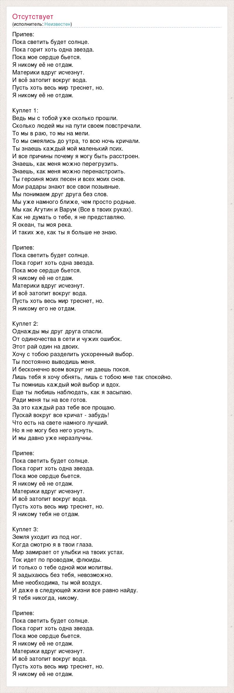 Припев: Пока светить будет солнце. Пока горит хоть одна звезда. Пока мое сердце бьется. Я никому её не отдам. Материки вдруг исчезнут. И всё затопит вокруг вода. Пусть хоть весь мир треснет, но. Я никому её не отдам. Куплет 1: Ведь мы с тобой уже сколько прошли. Сколько людей мы на пути своем повстречали. То мы в раю, то мы на мели. То мы смеялись до утра, то всю ночь кричали. Ты знаешь каждый мой маленький псих. И все причины почему я могу быть расстроен. Знаешь, как меня можно перегрузить. Знаешь, как меня можно перенастроить. Ты героиня моих песен и всех моих снов. Мои радары знают все свои позывные. Мы понимаем друг друга без слов. Мы уже намного ближе, чем просто родные. Мы как Агутин и Варум (Все в твоих руках). Как не думать о тебе, я не представляю. Я океан, ты моя река. И таких же, как ты я больше не знаю. Припев: Пока светить будет солнце. Пока горит хоть одна звезда. Пока мое сердце бьется. Я никому её не отдам. Материки вдруг исчезнут. И всё затопит вокруг вода. Пусть хоть весь мир треснет, но. Я никому его не отдам. Куплет 2: Однажды мы друг друга спасли. От одиночества в сети и чужих ошибок. Этот рай один на двоих. Хочу с тобою разделить ускоренный выбор. Ты постоянно выводишь меня. И бесконечно всем вокруг не даешь покоя. Лишь тебя я хочу обнять, лишь с тобою мне так спокойно. Ты помнишь каждый мой выбор и вдох. Еще ты любишь наблюдать, как я засыпаю. Ради меня ты на все готов. За это каждый раз тебе все прощаю. Пускай вокруг все кричат - забудь! Что есть на свете намного лучший. Но я не могу без него уснуть. И мы давно уже неразлучны. Припев: Пока светить будет солнце. Пока горит хоть одна звезда. Пока мое сердце бьется. Я никому её не отдам. Материки вдруг исчезнут. И всё затопит вокруг вода. Пусть хоть весь мир треснет, но. Я никому тебя не отдам. Куплет 3: Земля уходит из под ног. Когда смотрю я в твои глаза. Мир замирает от улыбки на твоих устах. Ток идет по проводам, флюиды. И только о тебе одной мои молитвы. Я задыхаюсь без тебя, невозможно. Мне необходима, ты мой воздух. И даже в следующей жизни все равно найду. Я тебя никогда, никому. Припев: Пока светить будет солнце. Пока горит хоть одна звезда. Пока мое сердце бьется. Я никому её не отдам. Материки вдруг исчезнут. И всё затопит вокруг вода. Пусть хоть весь мир треснет, но. Я никому её не отдам.