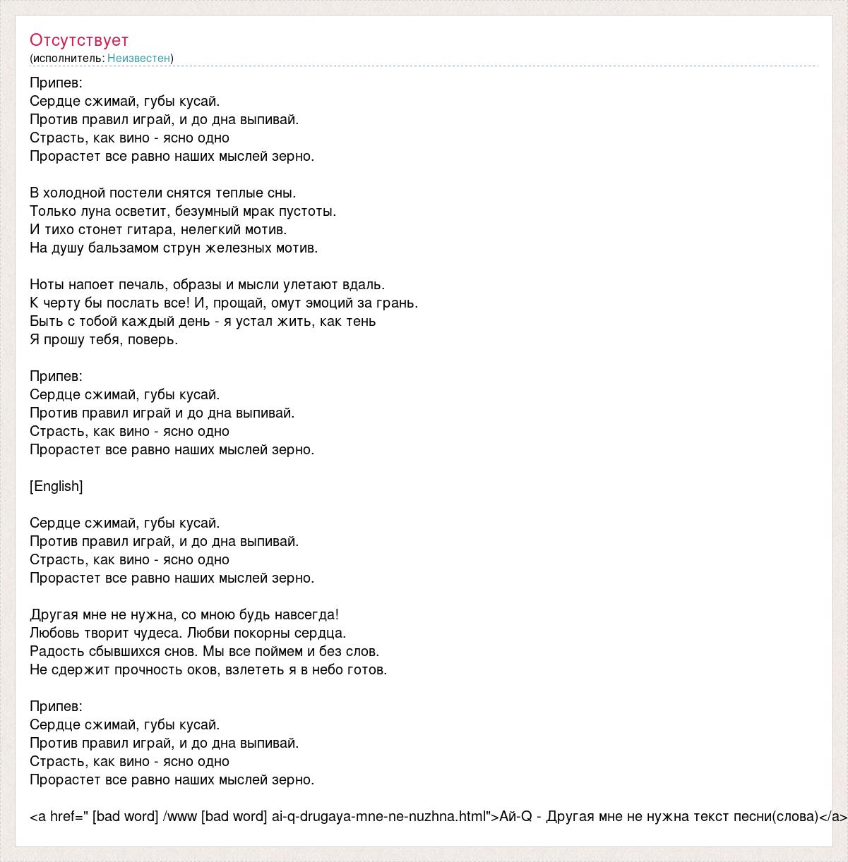 Припев: Сердце сжимай, губы кусай. Против правил играй, и до дна выпивай. Страсть, как вино - ясно одно Прорастет все равно наших мыслей зерно. В холодной постели снятся теплые сны. Только луна осветит, безумный мрак пустоты. И тихо стонет гитара, нелегкий мотив. На душу бальзамом струн железных мотив. Ноты напоет печаль, образы и мысли улетают вдаль. К черту бы послать все! И, прощай, омут эмоций за грань. Быть с тобой каждый день - я устал жить, как тень Я прошу тебя, поверь. Припев: Сердце сжимай, губы кусай. Против правил играй и до дна выпивай. Страсть, как вино - ясно одно Прорастет все равно наших мыслей зерно. [English] Сердце сжимай, губы кусай. Против правил играй, и до дна выпивай. Страсть, как вино - ясно одно Прорастет все равно наших мыслей зерно. Другая мне не нужна, со мною будь навсегда! Любовь творит чудеса. Любви покорны сердца. Радость сбывшихся снов. Мы все поймем и без слов. Не сдержит прочность оков, взлететь я в небо готов. Припев: Сердце сжимай, губы кусай. Против правил играй, и до дна выпивай. Страсть, как вино - ясно одно Прорастет все равно наших мыслей зерно. <a href=" [bad word] /www [bad word] ai-q-drugaya-mne-ne-nuzhna.html">Ай-Q - Другая мне не нужна текст песни(слова)</a>