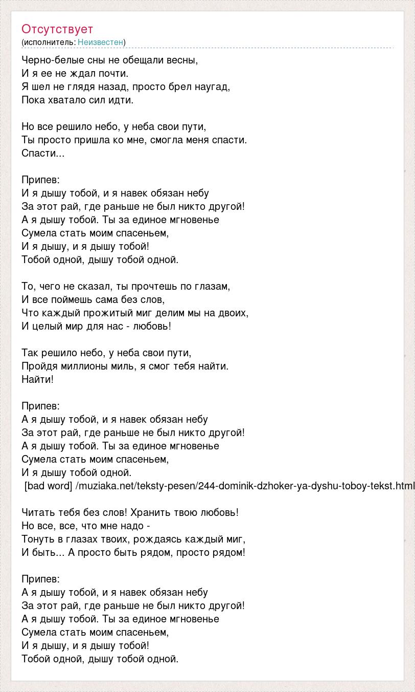 Черно-белые сны не обещали весны, И я ее не ждал почти. Я шел не глядя назад, просто брел наугад, Пока хватало сил идти. Но все решило небо, у неба свои пути, Ты просто пришла ко мне, смогла меня спасти. Спасти... Припев: И я дышу тобой, и я навек обязан небу За этот рай, где раньше не был никто другой! А я дышу тобой. Ты за единое мгновенье Сумела стать моим спасеньем, И я дышу, и я дышу тобой! Тобой одной, дышу тобой одной. То, чего не сказал, ты прочтешь по глазам, И все поймешь сама без слов, Что каждый прожитый миг делим мы на двоих, И целый мир для нас - любовь! Так решило небо, у неба свои пути, Пройдя миллионы миль, я смог тебя найти. Найти! Припев: А я дышу тобой, и я навек обязан небу За этот рай, где раньше не был никто другой! А я дышу тобой. Ты за единое мгновенье Сумела стать моим спасеньем, И я дышу тобой одной. [bad word] /muziaka.net/teksty-pesen/244-dominik-dzhoker-ya-dyshu-toboy-tekst.html Читать тебя без слов! Хранить твою любовь! Но все, все, что мне надо - Тонуть в глазах твоих, рождаясь каждый миг, И быть... А просто быть рядом, просто рядом! Припев: А я дышу тобой, и я навек обязан небу За этот рай, где раньше не был никто другой! А я дышу тобой. Ты за единое мгновенье Сумела стать моим спасеньем, И я дышу, и я дышу тобой! Тобой одной, дышу тобой одной.
