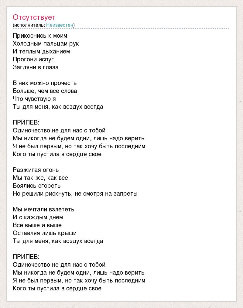 Прикоснись к моим Холодным пальцам рук И теплым дыханием Прогони испуг Загляни в глаза В них можно прочесть Больше, чем все слова Что чувствую я Ты для меня, как воздух всегда ПРИПЕВ: Одиночество не для нас с тобой Мы никогда не будем одни, лишь надо верить Я не был первым, но так хочу быть последним Кого ты пустила в сердце свое Разжигая огонь Мы так же, как все Боялись сгореть Но решили рискнуть, не смотря на запреты Мы мечтали взлететь И с каждым днем Всё выше и выше Оставляя лишь крыши Ты для меня, как воздух всегда ПРИПЕВ: Одиночество не для нас с тобой Мы никогда не будем одни, лишь надо верить Я не был первым, но так хочу быть последним Кого ты пустила в сердце свое