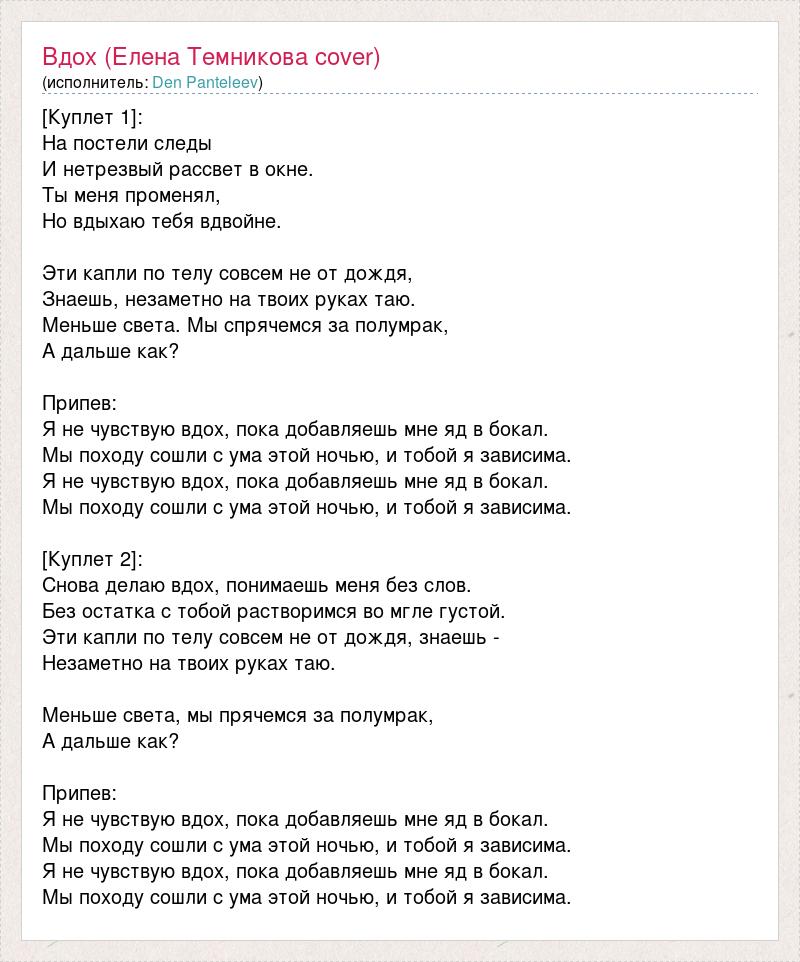 [Куплет 1]: На постели следы И нетрезвый рассвет в окне. Ты меня променял, Но вдыхаю тебя вдвойне. Эти капли по телу совсем не от дождя, Знаешь, незаметно на твоих руках таю. Меньше света. Мы спрячемся за полумрак, А дальше как? Припев: Я не чувствую вдох, пока добавляешь мне яд в бокал. Мы походу сошли с ума этой ночью, и тобой я зависима. Я не чувствую вдох, пока добавляешь мне яд в бокал. Мы походу сошли с ума этой ночью, и тобой я зависима. [Куплет 2]: Снова делаю вдох, понимаешь меня без слов. Без остатка с тобой растворимся во мгле густой. Эти капли по телу совсем не от дождя, знаешь - Незаметно на твоих руках таю. Меньше света, мы прячемся за полумрак, А дальше как? Припев: Я не чувствую вдох, пока добавляешь мне яд в бокал. Мы походу сошли с ума этой ночью, и тобой я зависима. Я не чувствую вдох, пока добавляешь мне яд в бокал. Мы походу сошли с ума этой ночью, и тобой я зависима.