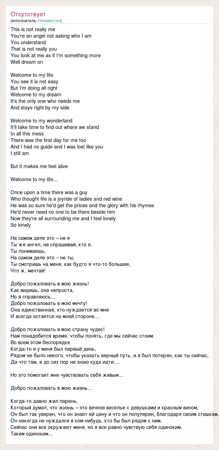 This is not really me You're an angel not asking who I am You understand That is not really you You look at me as if I'm something more Well dream on Welcome to my life You see it is not easy But I'm doing all right Welcome to my dream It's the only one who needs me And stays right by my side Welcome to my wonderland It'll take time to find out where we stand In all this mess There was the first day for me too And I had no guide and I was lost like you I still am But it makes me feel alive Welcome to my life... Once upon a time there was a guy Who thought life is a joyride of ladies and red wine He was so sure he'd get the prices and the glory with his rhymes He'd never need no one to be there beside him Now they're all surrounding me and I feel lonely So lonely На самом деле это – не я Ты же ангел, не спрашивай, кто я. Ты понимаешь, На самом деле это – не ты, Ты смотришь на меня, как будто я что-то большее, Что ж, мечтай! Добро пожаловать в мою жизнь! Как видишь, она непроста, Но я справляюсь... Добро пожаловать в мою мечту! Она единственная, кто нуждается во мне И всегда остается на моей стороне.... Добро пожаловать в мою страну чудес! Нам понадобится время, чтобы понять, где мы сейчас стоим. Во всем этом беспорядке Когда-то и у меня был первый день, Рядом не было никого, чтобы указать верный путь, и я был потерян, как ты сейчас, Да что там, я до сих пор не знаю куда идти.... Но это помогает мне чувствовать себя живым... Добро пожаловать в мою жизнь… Когда-то давно жил парень, Который думал, что жизнь – это вечное веселье с девушками и красным вином, Он был так уверен, что он знает ей цену и что он популярен, благодаря своим стишкам. Он никогда не нуждался в ком-нибудь, кто бы был рядом с ним, Сейчас они все окружают меня, но я все равно чувствую себя одиноким, Таким одиноким...