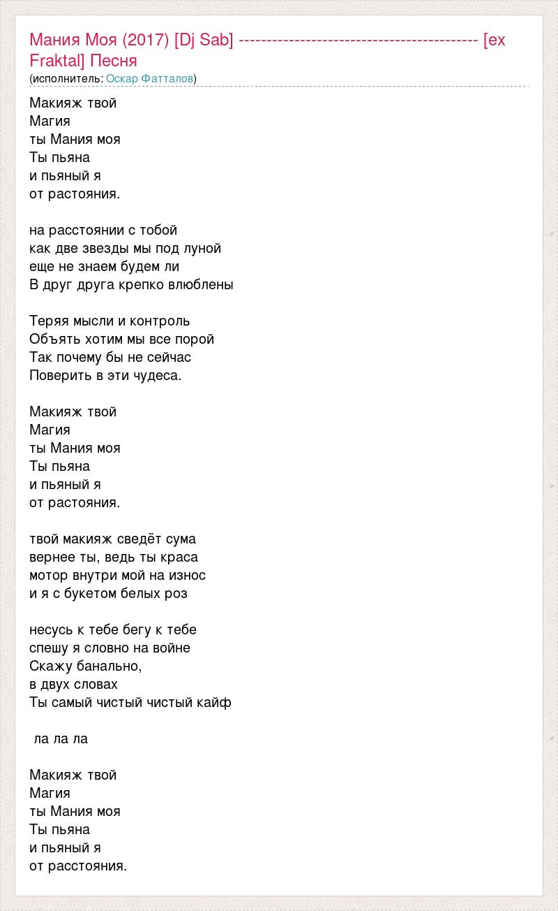 Макияж твой Магия ты Мания моя Ты пьяна и пьяный я от растояния. на расстоянии с тобой как две звезды мы под луной еще не знаем будем ли В друг друга крепко влюблены Теряя мысли и контроль Объять хотим мы все порой Так почему бы не сейчас Поверить в эти чудеса. Макияж твой Магия ты Мания моя Ты пьяна и пьяный я от растояния. твой макияж сведёт сума вернее ты, ведь ты краса мотор внутри мой на износ и я с букетом белых роз несусь к тебе бегу к тебе спешу я словно на войне Скажу банально, в двух словах Ты самый чистый чистый кайф ла ла ла Макияж твой Магия ты Мания моя Ты пьяна и пьяный я от расcтояния.