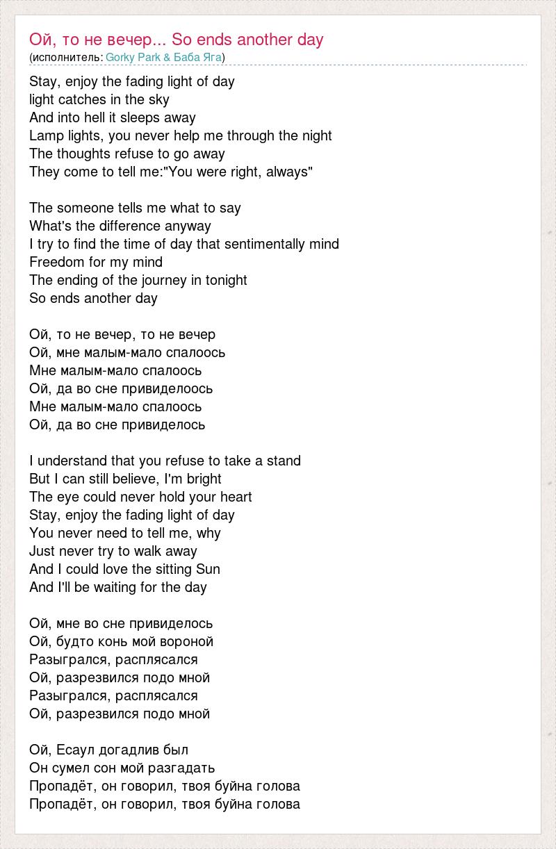 Stay, enjoy the fading light of day light catches in the sky And into hell it sleeps away Lamp lights, you never help me through the night The thoughts refuse to go away They come to tell me:"You were right, always" The someone tells me what to say What's the difference anyway I try to find the time of day that sentimentally mind Freedom for my mind The ending of the journey in tonight So ends another day Ой, то не вечер, то не вечер Ой, мне малым-мало спалоось Мне малым-мало спалоoсь Ой, да во сне привиделоoсь Мне малым-мало спалоoсь Ой, да во сне привиделось I understand that you refuse to take a stand But I can still believe, I'm bright The eye could never hold your heart Stay, enjoy the fading light of day You never need to tell me, why Just never try to walk away And I could love the sitting Sun And I'll be waiting for the day Ой, мне во сне привиделось Ой, будто конь мой вороной Разыгрался, расплясался Ой, разрезвился подо мной Разыгрался, расплясался Ой, разрезвился подо мной Ой, Есаул догадлив был Он сумел сон мой разгадать Пропадёт, он говорил, твоя буйна голова Пропадёт, он говорил, твоя буйна голова