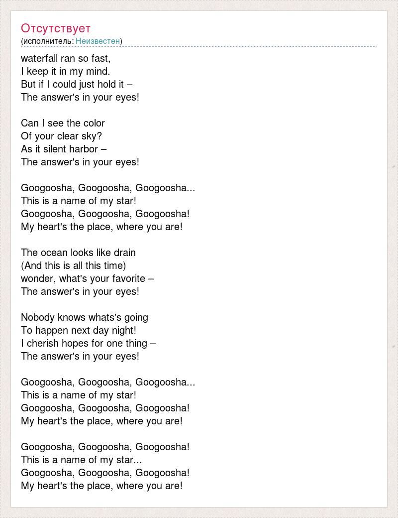 waterfall ran so fast, I keep it in my mind. But if I could just hold it – The answer's in your eyes! Can I see the color Of your clear sky? As it silent harbor – The answer's in your eyes! Googoosha, Googoosha, Googoosha... This is a name of my star! Googoosha, Googoosha, Googoosha! My heart's the place, where you are! The ocean looks like drain (And this is all this time) wonder, what's your favorite – The answer's in your eyes! Nobody knows whats's going To happen next day night! I cherish hopes for one thing – The answer's in your eyes! Googoosha, Googoosha, Googoosha... This is a name of my star! Googoosha, Googoosha, Googoosha! My heart's the place, where you are! Googoosha, Googoosha, Googoosha! This is a name of my star... Googoosha, Googoosha, Googoosha! My heart's the place, where you are!