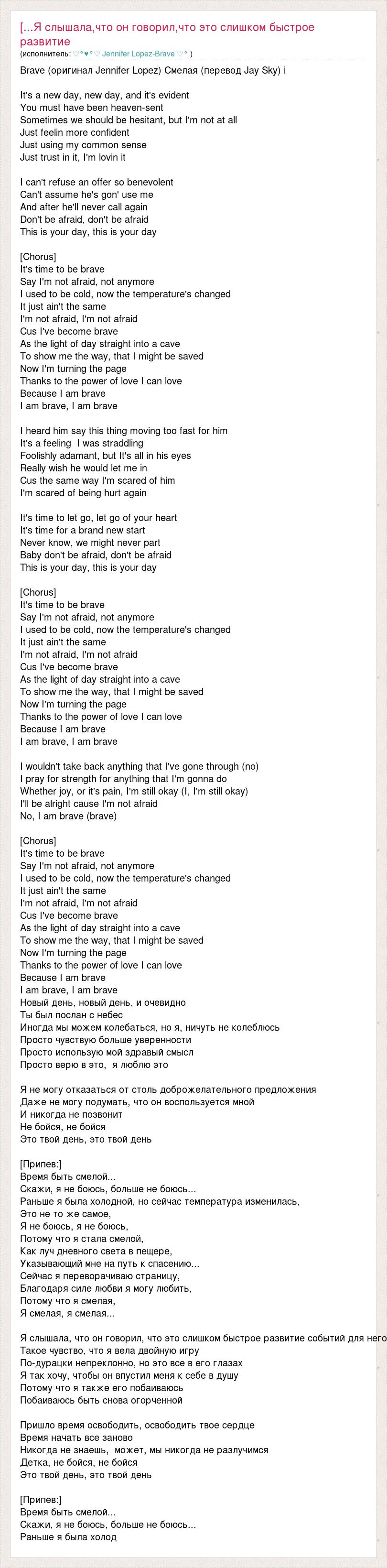 Brave (оригинал Jennifer Lopez) Смелая (перевод Jay Sky) i It's a new day, new day, and it's evident You must have been heaven-sent Sometimes we should be hesitant, but I'm not at all Just feelin more confident Just using my common sense Just trust in it, I'm lovin it I can't refuse an offer so benevolent Can't assume he's gon' use me And after he'll never call again Don't be afraid, don't be afraid This is your day, this is your day [Chorus] It's time to be brave Say I'm not afraid, not anymore I used to be cold, now the temperature's changed It just ain't the same I'm not afraid, I'm not afraid Cus I've become brave As the light of day straight into a cave To show me the way, that I might be saved Now I'm turning the page Thanks to the power of love I can love Because I am brave I am brave, I am brave I heard him say this thing moving too fast for him It's a feeling I was straddling Foolishly adamant, but It's all in his eyes Really wish he would let me in Cus the same way I'm scared of him I'm scared of being hurt again It's time to let go, let go of your heart It's time for a brand new start Never know, we might never part Baby don't be afraid, don't be afraid This is your day, this is your day [Chorus] It's time to be brave Say I'm not afraid, not anymore I used to be cold, now the temperature's changed It just ain't the same I'm not afraid, I'm not afraid Cus I've become brave As the light of day straight into a cave To show me the way, that I might be saved Now I'm turning the page Thanks to the power of love I can love Because I am brave I am brave, I am brave I wouldn't take back anything that I've gone through (no) I pray for strength for anything that I'm gonna do Whether joy, or it's pain, I'm still okay (I, I'm still okay) I'll be alright cause I'm not afraid No, I am brave (brave) [Chorus] It's time to be brave Say I'm not afraid, not anymore I used to be cold, now the temperature's changed It just ain't the same I'm not afraid, I'm not afraid Cus I've become brave As the light of day straight into a cave To show me the way, that I might be saved Now I'm turning the page Thanks to the power of love I can love Because I am brave I am brave, I am brave Новый день, новый день, и очевидно Ты был послан с небес Иногда мы можем колебаться, но я, ничуть не колеблюсь Просто чувствую больше уверенности Просто использую мой здравый смысл Просто верю в это, я люблю это Я не могу отказаться от столь доброжелательного предложения Даже не могу подумать, что он воспользуется мной И никогда не позвонит Не бойся, не бойся Это твой день, это твой день [Припев:] Время быть смелой... Скажи, я не боюсь, больше не боюсь... Раньше я была холодной, но сейчас температура изменилась, Это не то же самое, Я не боюсь, я не боюсь, Потому что я стала смелой, Как луч дневного света в пещере, Указывающий мне на путь к спасению... Сейчас я переворачиваю страницу, Благодаря силе любви я могу любить, Потому что я смелая, Я смелая, я смелая... Я слышала, что он говорил, что это слишком быстрое развитие событий для него Такое чувство, что я вела двойную игру По-дурацки непреклонно, но это все в его глазах Я так хочу, чтобы он впустил меня к себе в душу Потому что я также его побаиваюсь Побаиваюсь быть снова огорченной Пришло время освободить, освободить твое сердце Время начать все заново Никогда не знаешь, может, мы никогда не разлучимся Детка, не бойся, не бойся Это твой день, это твой день [Припев:] Время быть смелой... Скажи, я не боюсь, больше не боюсь... Раньше я была холод