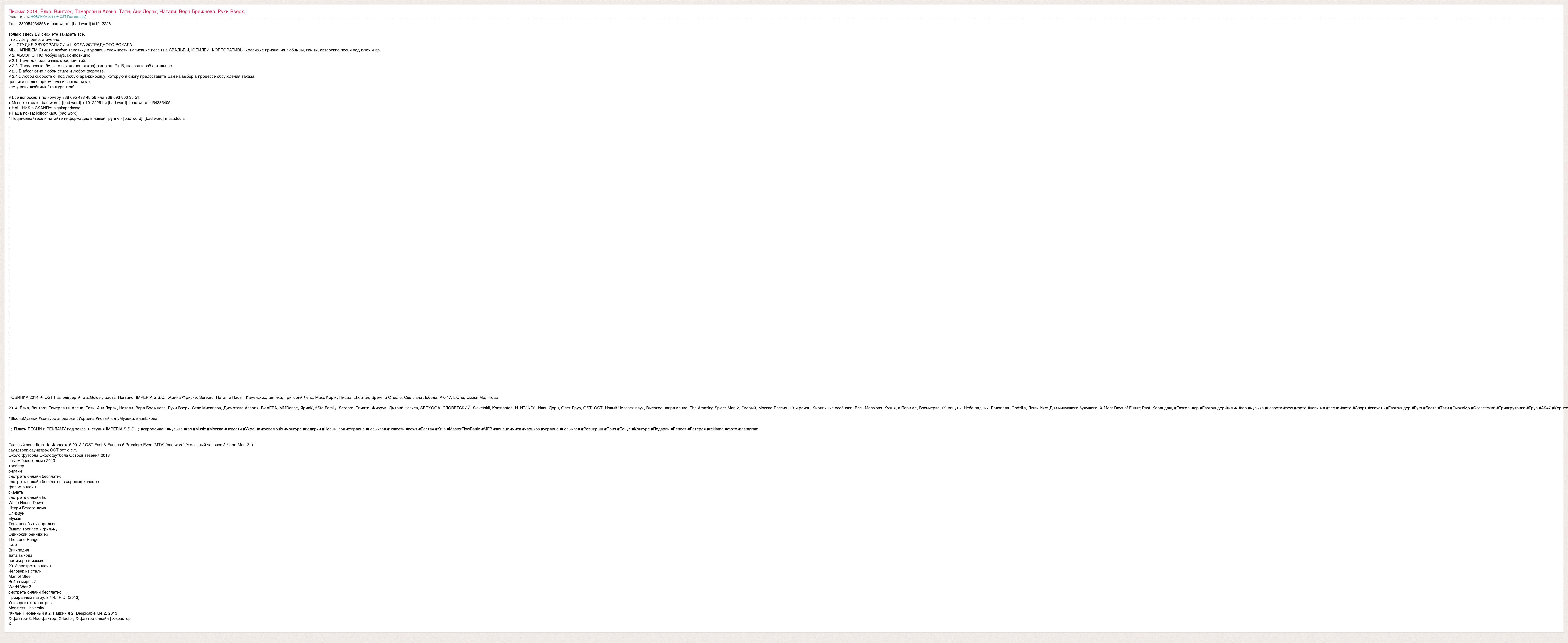 Тел.+380954934856 и [bad word] [bad word] id10122261 только здесь Вы сможете заказать всё, что душе угодно, а именно: ✔1. СТУДИЯ ЗВУКОЗАПИСИ и ШКОЛА ЭСТРАДНОГО ВОКАЛА. МЫ НАПИШЕМ Стих на любую тематику и уровень сложности. написание песен на СВАДЬБЫ, ЮБИЛЕИ, КОРПОРАТИВЫ, красивые признания любимым, гимны, авторские песни под ключ и др. ✔2. АБСОЛЮТНО любую муз. композицию: ✔2.1. Гимн для различных мероприятий. ✔2.2. Трек/ песню, будь то вокал (поп, джаз), хип-хоп, R'n'B, шансон и всё остальное. ✔2.3 В абсолютно любом стиле и любом формате. ✔2.4 с любой скоростью, под любую аранжировку, которую я смогу предоставить Вам на выбор в процессе обсуждения заказа. ценники вполне приемлемы и всегда ниже, чем у моих любимых "конкурентов" ✔Все вопросы: ♦ по номеру +38 095 493 48 56 или +38 093 800 35 51. ♦ Мы в контакте [bad word] [bad word] id10122261 и [bad word] [bad word] id54335405 ♦ НАШ НИК в СКАЙПе: olgaimperiassc ♦ Наша почта: lolitochka88 [bad word] * Подписывайтесь и читайте информацию в нашей группе - [bad word] [bad word] muz.studia __________________________________________ ! ! ! ! ! ! ! ! ! ! ! ! ! ! ! ! ! ! ! ! ! ! ! ! ! ! ! ! ! ! ! ! ! ! ! ! ! ! ! ! ! ! ! ! ! ! ! ! ! ! ! НОВИНКА 2014 ★ OST Газгольдер ★ GazGolder, Баста, Ноггано, IMPERIA S.S.C., Жанна Фриске, Serebro, Потап и Настя, Каменских, Бьянка, Григорий Лепс, Макс Корж, Пицца, Джиган, Время и Стекло, Светлана Лобода, АК-47, L'One, Смоки Мо, Нюша 2014, Ёлка, Винтаж, Тамерлан и Алена, Тати, Ани Лорак, Натали, Вера Брежнева, Руки Вверх, Стас Михайлов, Дискотека Авария, ВИАГРА, MMDance, ЯрмаК, 5Sta Family, Serebro, Тимати, Физрук, Дмтрий Нагиев, SERYOGA, СЛОВЕТСКИЙ, Slovetskii, Konstantah, N1NT3ND0, Иван Дорн, Олег Груз, OST, ОСТ, Новый Человек-паук, Высокое напряжение, The Amazing Spider-Man 2, Скорый, Москва-Россия, 13-й район, Кирпичные особняки, Brick Mansions, Кухня, в Париже, Восьмерка, 22 минуты, Небо падших, Годзилла, Godzilla, Люди Икс: Дни минувшего будущего, X-Men: Days of Future Past, Карандаш, #Газгольдер #ГазгольдерФильм #rap #музыка #новости #new #фото #новинка #весна #лето #Спорт #скачать #Газгольдер #Гуф #Баста #Тати #СмокиМо #Словетский #Триагрутрика #Груз #АК47 #Кернес #ШколаМузыки #конкурс #подарки #Украина #новыйгод #МузыкальнаяШкола ! !♫ Пишем ПЕСНИ и РЕКЛАМУ под заказ ★ студия IMPERIA S.S.C. ♫ #євромайдан #музыка #rap #Music #Москва #новости #Україна #революція #конкурс #подарки #Новый_год #Украина #новыйгод #новости #news #Баста4 #Київ #MasterFlowBattle #MFB #донецк #киев #харьков #украина #новыйгод #Розыгрыш #Приз #Бонус #Конкурс #Подарки #Репост #Лотерея #reklama #фото #instagram ! Главный soundtrack to Форсаж 6 2013 / OST Fast & Furious 6 Premiere Even [MTV] [bad word] Железный человек 3 / Iron-Man-3 :) саундтрек саундтрэк ОСТ ост о.с.т. Около футбола Околофутбола Остров везения 2013 штурм белого дома 2013 трейлер онлайн смотреть онлайн бесплатно смотреть онлайн бесплатно в хорошем качестве фильм онлайн скачать смотреть онлайн hd White House Down Штурм Белого дома Элизиум Elysium Тени незабытых предков Вышел трейлер к фильму Одинокий рейнджер The Lone Ranger вики Википедия дата выхода премьера в москве 2013 смотреть онлайн Человек из стали Man of Steel Война миров Z World War Z смотреть онлайн бесплатно Призрачный патруль / R.I.P.D. (2013) Университет монстров Monsters University Фильм Никчемный я 2, Гадкий я 2, Despicable Me 2, 2013 Х-фактор-3. Икс-фактор, X-factor, Х-фактор онлайн | Х-фактор Х-