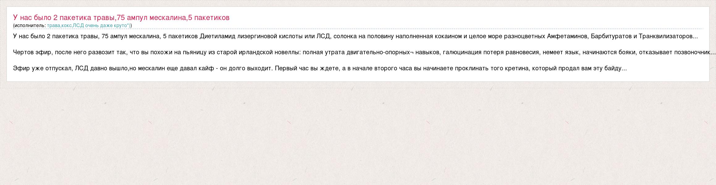 Главная→Исполнители→Неизвестен→У нас было 2 пакетика травы, 75 ампул мескалина, 5 пакетиков Диетиламид лизергин