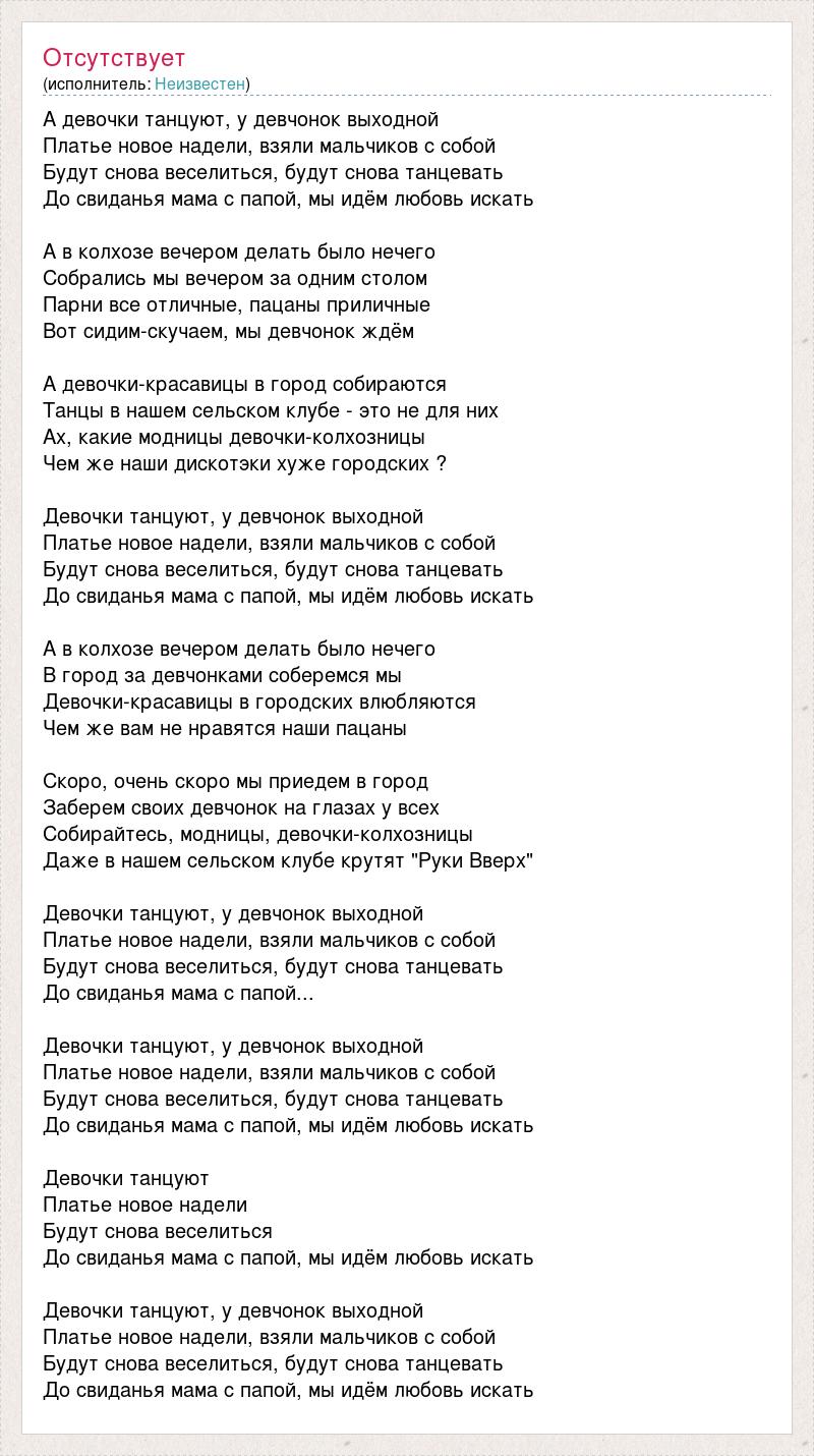 А девочки танцуют, у девчонок выходной Платье новое надели, взяли мальчиков с собой Будут снова веселиться, будут снова танцевать До свиданья мама с папой, мы идём любовь искать А в колхозе вечером делать было нечего Собрались мы вечером за одним столом Парни все отличные, пацаны приличные Вот сидим-скучаем, мы девчонок ждём А девочки-красавицы в город собираются Танцы в нашем сельском клубе - это не для них Ах, какие модницы девочки-колхозницы Чем же наши дискотэки хуже городских ? Девочки танцуют, у девчонок выходной Платье новое надели, взяли мальчиков с собой Будут снова веселиться, будут снова танцевать До свиданья мама с папой, мы идём любовь искать А в колхозе вечером делать было нечего В город за девчонками соберемся мы Девочки-красавицы в городских влюбляются Чем же вам не нравятся наши пацаны Скоро, очень скоро мы приедем в город Заберем своих девчонок на глазах у всех Собирайтесь, модницы, девочки-колхозницы Даже в нашем сельском клубе крутят "Руки Вверх" Девочки танцуют, у девчонок выходной Платье новое надели, взяли мальчиков с собой Будут снова веселиться, будут снова танцевать До свиданья мама с папой... Девочки танцуют, у девчонок выходной Платье новое надели, взяли мальчиков с собой Будут снова веселиться, будут снова танцевать До свиданья мама с папой, мы идём любовь искать Девочки танцуют Платье новое надели Будут снова веселиться До свиданья мама с папой, мы идём любовь искать Девочки танцуют, у девчонок выходной Платье новое надели, взяли мальчиков с собой Будут снова веселиться, будут снова танцевать До свиданья мама с папой, мы идём любовь искать