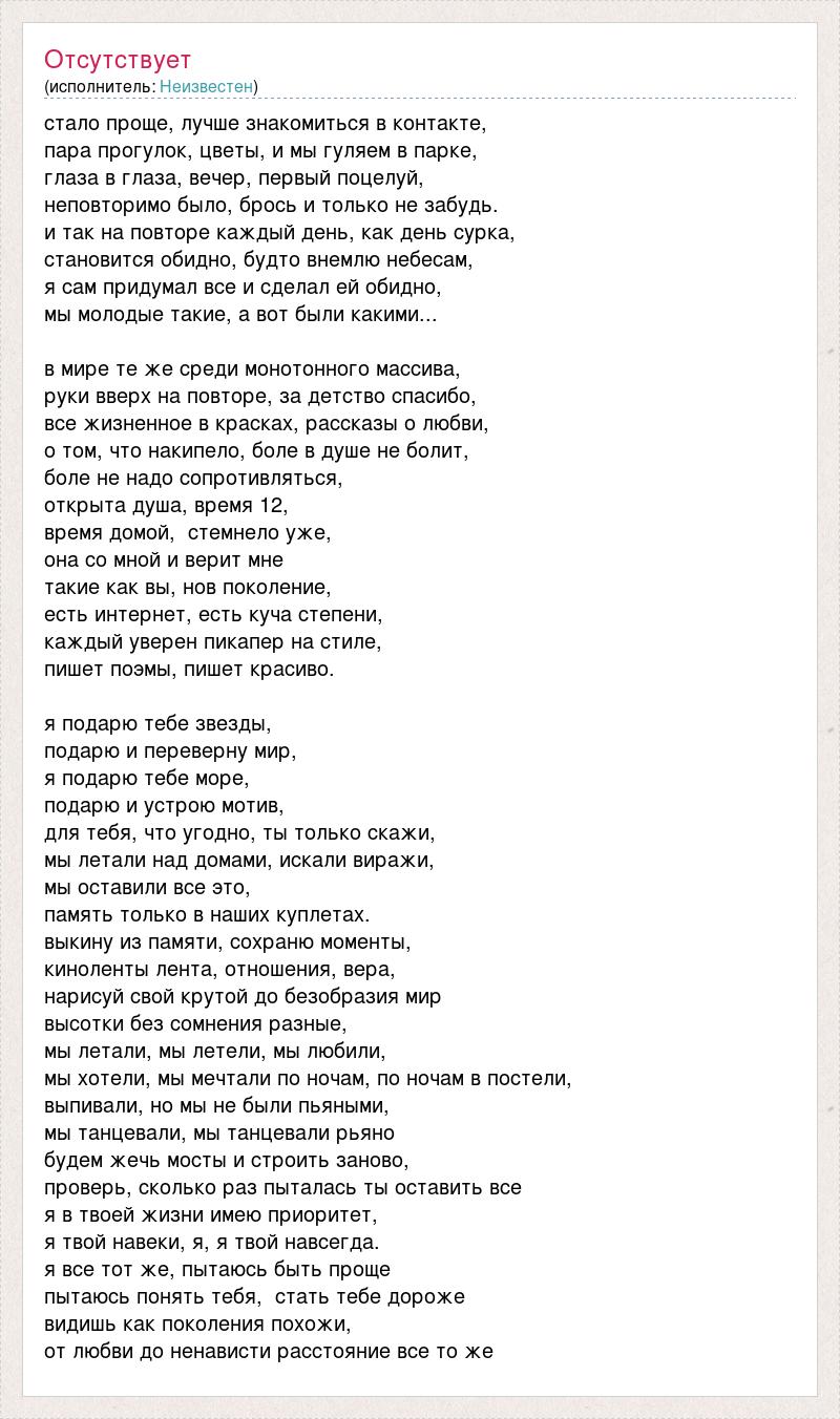 стало проще, лучше знакомиться в контакте, пара прогулок, цветы, и мы гуляем в парке, глаза в глаза, вечер, первый поцелуй, неповторимо было, брось и только не забудь. и так на повторе каждый день, как день сурка, становится обидно, будто внемлю небесам, я сам придумал все и сделал ей обидно, мы молодые такие, а вот были какими... в мире те же среди монотонного массива, руки вверх на повторе, за детство спасибо, все жизненное в красках, рассказы о любви, о том, что накипело, боле в душе не болит, боле не надо сопротивляться, открыта душа, время 12, время домой, стемнело уже, она со мной и верит мне такие как вы, нов поколение, есть интернет, есть куча степени, каждый уверен пикапер на стиле, пишет поэмы, пишет красиво. я подарю тебе звезды, подарю и переверну мир, я подарю тебе море, подарю и устрою мотив, для тебя, что угодно, ты только скажи, мы летали над домами, искали виражи, мы оставили все это, память только в наших куплетах. выкину из памяти, сохраню моменты, киноленты лента, отношения, вера, нарисуй свой крутой до безобразия мир высотки без сомнения разные, мы летали, мы летели, мы любили, мы хотели, мы мечтали по ночам, по ночам в постели, выпивали, но мы не были пьяными, мы танцевали, мы танцевали рьяно будем жечь мосты и строить заново, проверь, сколько раз пыталась ты оставить все я в твоей жизни имею приоритет, я твой навеки, я, я твой навсегда. я все тот же, пытаюсь быть проще пытаюсь понять тебя, стать тебе дороже видишь как поколения похожи, от любви до ненависти расстояние все то же