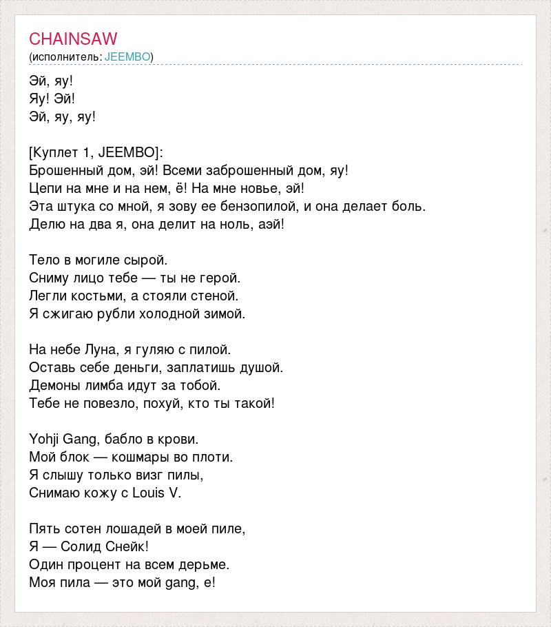 Эй, яу! Яу! Эй! Эй, яу, яу! [Куплет 1, JEEMBO]: Брошенный дом, эй! Всеми заброшенный дом, яу! Цепи на мне и на нем, ё! На мне новье, эй! Эта штука со мной, я зову ее бензопилой, и она делает боль. Делю на два я, она делит на ноль, aэй! Тело в могиле сырой. Сниму лицо тебе — ты не герой. Легли костьми, а стояли стеной. Я сжигаю рубли холодной зимой. На небе Луна, я гуляю с пилой. Оставь себе деньги, заплатишь душой. Демоны лимба идут за тобой. Тебе не повезло, похуй, кто ты такой! Yohji Gang, бабло в крови. Мой блок — кошмары во плоти. Я слышу только визг пилы, Снимаю кожу с Louis V. Пять сотен лошадей в моей пиле, Я — Солид Снейк! Один процент на всем дерьме. Моя пила — это мой gang, е!