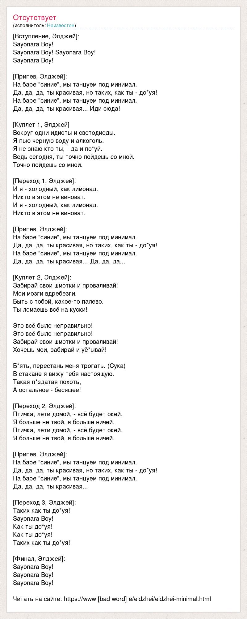 [Вступление, Элджей]: Sayonara Boy! Sayonara Boy! Sayonara Boy! Sayonara Boy! [Припев, Элджей]: На баре "синие", мы танцуем под минимал. Да, да, да, ты красивая, но таких, как ты - до*уя! На баре "синие", мы танцуем под минимал. Да, да, да, ты красивая... Иди сюда! [Куплет 1, Элджей] Вокруг одни идиоты и светодиоды. Я пью черную воду и алкоголь. Я не знаю кто ты, - да и по*уй. Ведь сегодня, ты точно пойдешь со мной. Точно пойдешь со мной. [Переход 1, Элджей]: И я - холодный, как лимонад. Никто в этом не виноват. И я - холодный, как лимонад. Никто в этом не виноват. [Припев, Элджей]: На баре "синие", мы танцуем под минимал. Да, да, да, ты красивая, но таких, как ты - до*уя! На баре "синие", мы танцуем под минимал. Да, да, да, ты красивая... Да, да, да... [Куплет 2, Элджей]: Забирай свои шмотки и проваливай! Мои мозги вдребезги. Быть с тобой, какое-то палево. Ты ломаешь всё на куски! Это всё было неправильно! Это всё было неправильно! Забирай свои шмотки и проваливай! Хочешь мои, забирай и уё*ывай! Б*ять, перестань меня трогать. (Сука) В стакане я вижу тебя настоящую. Такая п*здатая похоть, А остальное - бесящее! [Переход 2, Элджей]: Птичка, лети домой, - всё будет окей. Я больше не твой, я больше ничей. Птичка, лети домой, - всё будет окей. Я больше не твой, я больше ничей. [Припев, Элджей]: На баре "синие", мы танцуем под минимал. Да, да, да, ты красивая, но таких, как ты - до*уя! На баре "синие", мы танцуем под минимал. Да, да, да, ты красивая... [Переход 3, Элджей]: Таких как ты до*уя! Sayonara Boy! Как ты до*уя! Как ты до*уя! Таких как ты до*уя! [Финал, Элджей]: Sayonara Boy! Sayonara Boy! Sayonara Boy! Читать на сайте: https://www [bad word] e/eldzhei/eldzhei-minimal.html