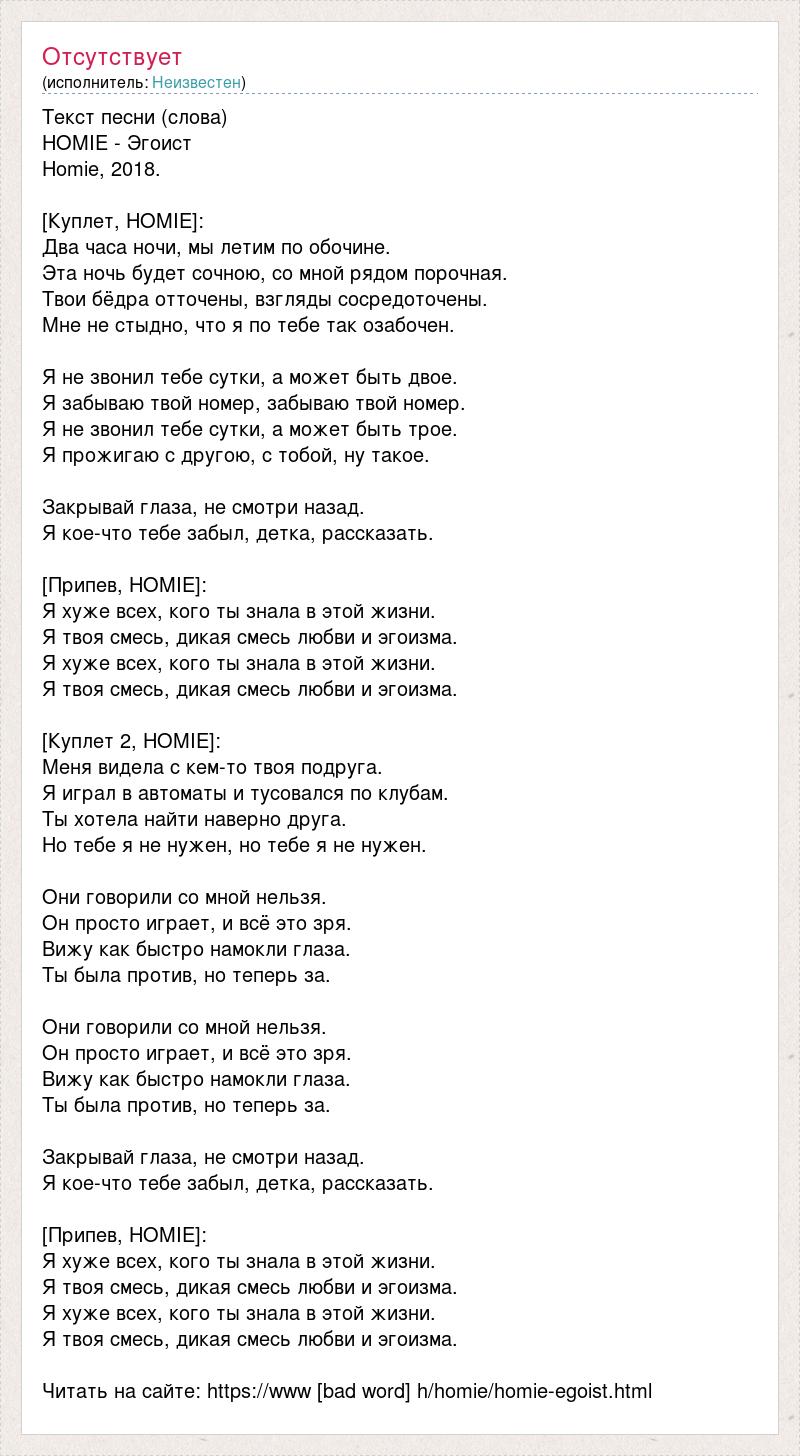 Текст песни (слова) HOMIE - Эгоист Homie, 2018. [Куплет, HOMIE]: Два часа ночи, мы летим по обочине. Эта ночь будет сочною, со мной рядом порочная. Твои бёдра отточены, взгляды сосредоточены. Мне не стыдно, что я по тебе так озабочен. Я не звонил тебе сутки, а может быть двое. Я забываю твой номер, забываю твой номер. Я не звонил тебе сутки, а может быть трое. Я прожигаю с другою, с тобой, ну такое. Закрывай глаза, не смотри назад. Я кое-что тебе забыл, детка, рассказать. [Припев, HOMIE]: Я хуже всех, кого ты знала в этой жизни. Я твоя смесь, дикая смесь любви и эгоизма. Я хуже всех, кого ты знала в этой жизни. Я твоя смесь, дикая смесь любви и эгоизма. [Куплет 2, HOMIE]: Меня видела с кем-то твоя подруга. Я играл в автоматы и тусовался по клубам. Ты хотела найти наверно друга. Но тебе я не нужен, но тебе я не нужен. Они говорили со мной нельзя. Он просто играет, и всё это зря. Вижу как быстро намокли глаза. Ты была против, но теперь за. Они говорили со мной нельзя. Он просто играет, и всё это зря. Вижу как быстро намокли глаза. Ты была против, но теперь за. Закрывай глаза, не смотри назад. Я кое-что тебе забыл, детка, рассказать. [Припев, HOMIE]: Я хуже всех, кого ты знала в этой жизни. Я твоя смесь, дикая смесь любви и эгоизма. Я хуже всех, кого ты знала в этой жизни. Я твоя смесь, дикая смесь любви и эгоизма. Читать на сайте: https://www [bad word] h/homie/homie-egoist.html