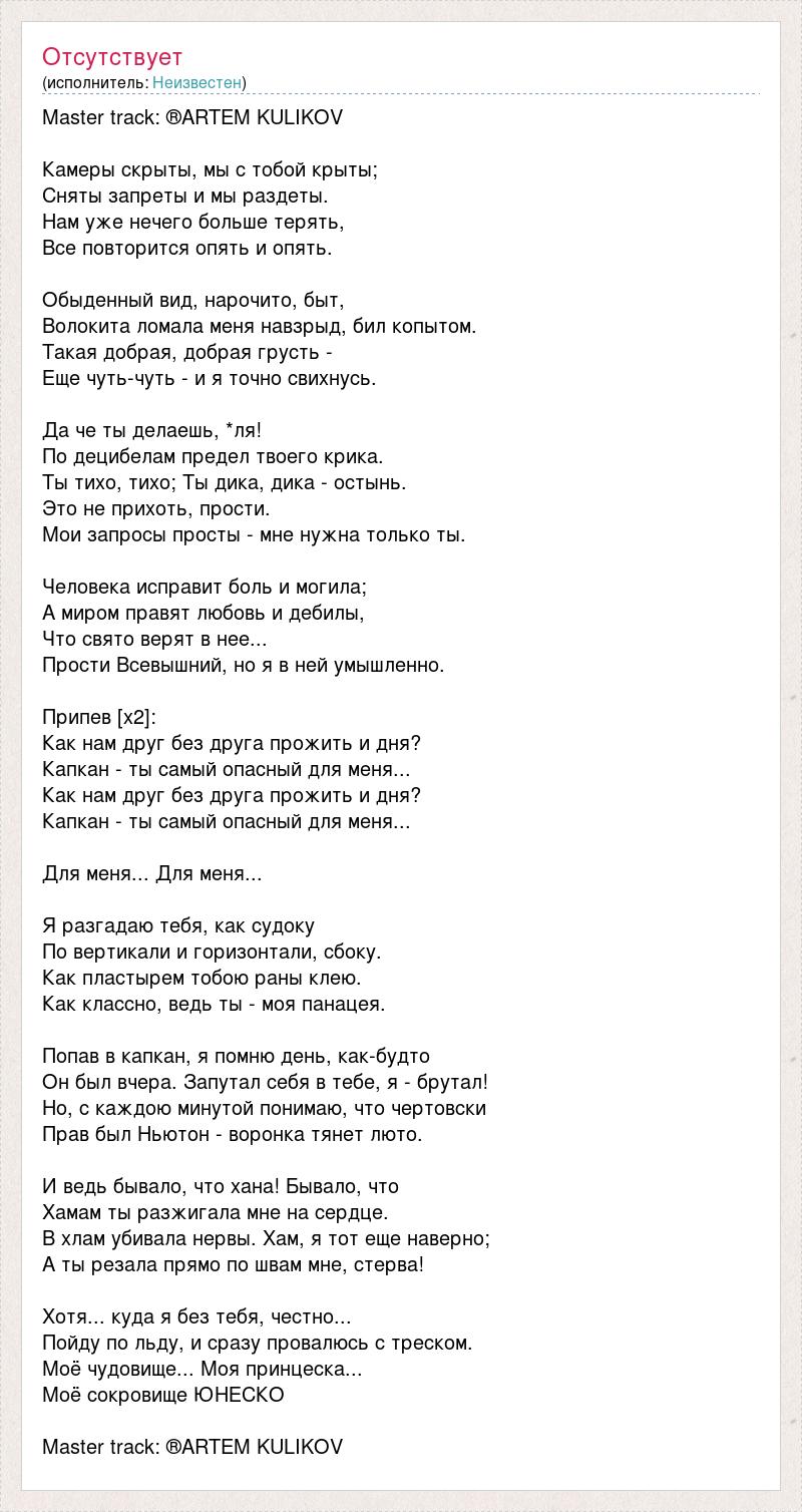Master track: ®ARTEM KULIKOV Камеры скрыты, мы с тобой крыты; Сняты запреты и мы раздеты. Нам уже нечего больше терять, Все повторится опять и опять. Обыденный вид, нарочито, быт, Волокита ломала меня навзрыд, бил копытом. Такая добрая, добрая грусть - Еще чуть-чуть - и я точно свихнусь. Да че ты делаешь, *ля! По децибелам предел твоего крика. Ты тихо, тихо; Ты дика, дика - остынь. Это не прихоть, прости. Мои запросы просты - мне нужна только ты. Человека исправит боль и могила; А миром правят любовь и дебилы, Что свято верят в нее... Прости Всевышний, но я в ней умышленно. Припев [x2]: Как нам друг без друга прожить и дня? Капкан - ты самый опасный для меня... Как нам друг без друга прожить и дня? Капкан - ты самый опасный для меня... Для меня... Для меня... Я разгадаю тебя, как судоку По вертикали и горизонтали, сбоку. Как пластырем тобою раны клею. Как классно, ведь ты - моя панацея. Попав в капкан, я помню день, как-будто Он был вчера. Запутал себя в тебе, я - брутал! Но, с каждою минутой понимаю, что чертовски Прав был Ньютон - воронка тянет люто. И ведь бывало, что хана! Бывало, что Хамам ты разжигала мне на сердце. В хлам убивала нервы. Хам, я тот еще наверно; А ты резала прямо по швам мне, стерва! Хотя... куда я без тебя, честно... Пойду по льду, и сразу провалюсь с треском. Моё чудовище... Моя принцеска... Моё сокровище ЮНЕСКО Master track: ®ARTEM KULIKOV