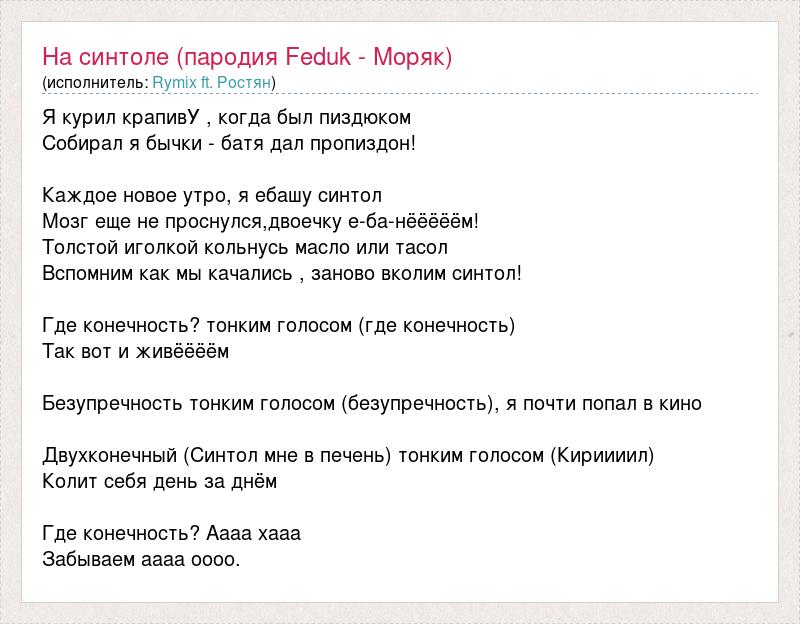 Я курил крапивУ , когда был пиздюком Собирал я бычки - батя дал пропиздон! Каждое новое утро, я ебашу синтол Мозг еще не проснулся,двоечку е-ба-нёёёёём! Толстой иголкой кольнусь масло или тасол Вспомним как мы качались , заново вколим синтол! Где конечность? тонким голосом (где конечность) Так вот и живёёёём Безупречность тонким голосом (безупречность), я почти попал в кино Двухконечный (Синтол мне в печень) тонким голосом (Кириииил) Колит себя день за днём Где конечность? Аааа хааа Забываем аааа оооо.