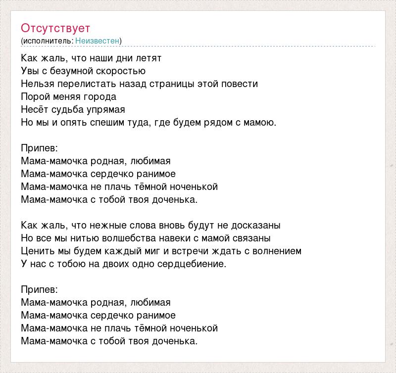 Как жаль, что наши дни летят Увы с безумной скоростью Нельзя перелистать назад страницы этой повести Порой меняя города Несёт судьба упрямая Но мы и опять спешим туда, где будем рядом с мамою. Припев: Мама-мамочка родная, любимая Мама-мамочка сердечко ранимое Мама-мамочка не плачь тёмной ноченькой Мама-мамочка с тобой твоя доченька. Как жаль, что нежные слова вновь будут не досказаны Но все мы нитью волшебства навеки с мамой связаны Ценить мы будем каждый миг и встречи ждать с волнением У нас с тобою на двоих одно сердцебиение. Припев: Мама-мамочка родная, любимая Мама-мамочка сердечко ранимое Мама-мамочка не плачь тёмной ноченькой Мама-мамочка с тобой твоя доченька.