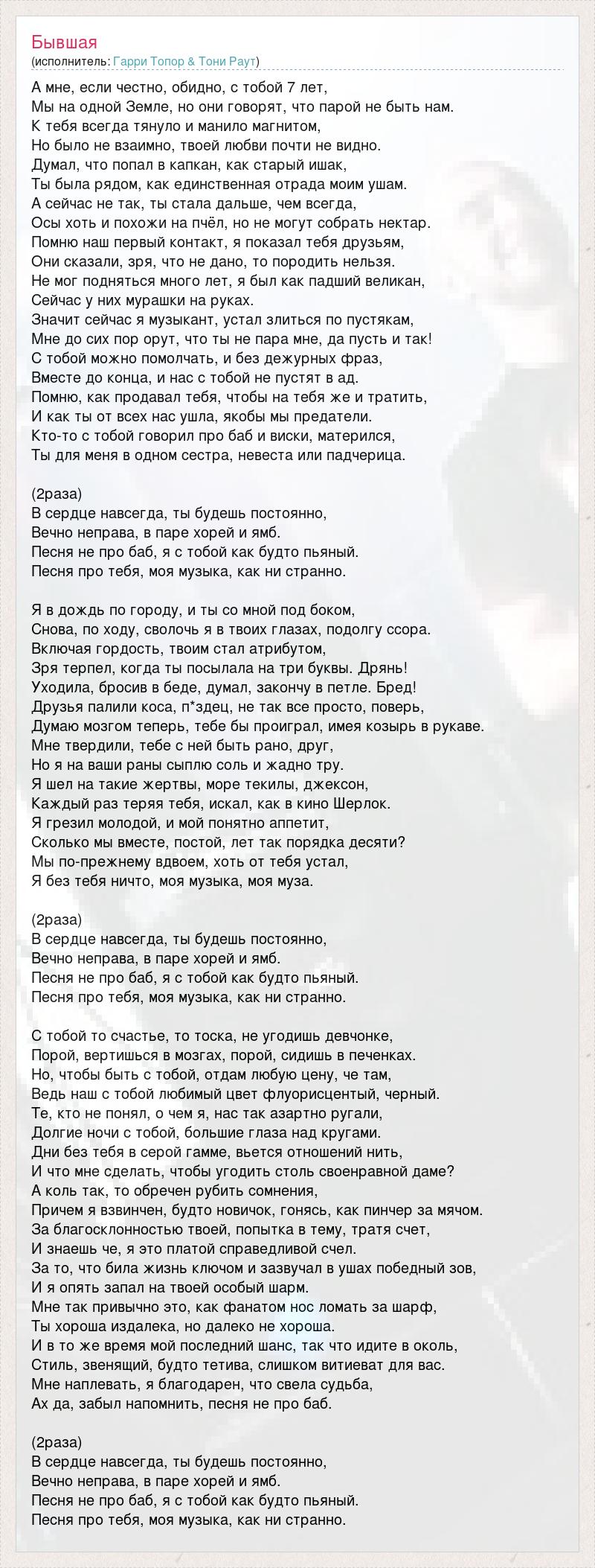 А мне, если честно, обидно, с тобой 7 лет, Мы на одной Земле, но они говорят, что парой не быть нам. К тебя всегда тянуло и манило магнитом, Но было не взаимно, твоей любви почти не видно. Думал, что попал в капкан, как старый ишак, Ты была рядом, как единственная отрада моим ушам. А сейчас не так, ты стала дальше, чем всегда, Осы хоть и похожи на пчёл, но не могут собрать нектар. Помню наш первый контакт, я показал тебя друзьям, Они сказали, зря, что не дано, то породить нельзя. Не мог подняться много лет, я был как падший великан, Сейчас у них мурашки на руках. Значит сейчас я музыкант, устал злиться по пустякам, Мне до сих пор орут, что ты не пара мне, да пусть и так! С тобой можно помолчать, и без дежурных фраз, Вместе до конца, и нас с тобой не пустят в ад. Помню, как продавал тебя, чтобы на тебя же и тратить, И как ты от всех нас ушла, якобы мы предатели. Кто-то с тобой говорил про баб и виски, матерился, Ты для меня в одном сестра, невеста или падчерица. (2раза) В сердце навсегда, ты будешь постоянно, Вечно неправа, в паре хорей и ямб. Песня не про баб, я с тобой как будто пьяный. Песня про тебя, моя музыка, как ни странно. Я в дождь по городу, и ты со мной под боком, Снова, по ходу, сволочь я в твоих глазах, подолгу ссора. Включая гордость, твоим стал атрибутом, Зря терпел, когда ты посылала на три буквы. Дрянь! Уходила, бросив в беде, думал, закончу в петле. Бред! Друзья палили коса, п*здец, не так все просто, поверь, Думаю мозгом теперь, тебе бы проиграл, имея козырь в рукаве. Мне твердили, тебе с ней быть рано, друг, Но я на ваши раны сыплю соль и жадно тру. Я шел на такие жертвы, море текилы, джексон, Каждый раз теряя тебя, искал, как в кино Шерлок. Я грезил молодой, и мой понятно аппетит, Сколько мы вместе, постой, лет так порядка десяти? Мы по-прежнему вдвоем, хоть от тебя устал, Я без тебя ничто, моя музыка, моя муза. (2раза) В сердце навсегда, ты будешь постоянно, Вечно неправа, в паре хорей и ямб. Песня не про баб, я с тобой как будто пьяный. Песня про тебя, моя музыка, как ни странно. С тобой то счастье, то тоска, не угодишь девчонке, Порой, вертишься в мозгах, порой, сидишь в печенках. Но, чтобы быть с тобой, отдам любую цену, че там, Ведь наш с тобой любимый цвет флуорисцентый, черный. Те, кто не понял, о чем я, нас так азартно ругали, Долгие ночи с тобой, большие глаза над кругами. Дни без тебя в серой гамме, вьется отношений нить, И что мне сделать, чтобы угодить столь своенравной даме? А коль так, то обречен рубить сомнения, Причем я взвинчен, будто новичок, гонясь, как пинчер за мячом. За благосклонностью твоей, попытка в тему, тратя счет, И знаешь че, я это платой справедливой счел. За то, что била жизнь ключом и зазвучал в ушах победный зов, И я опять запал на твоей особый шарм. Мне так привычно это, как фанатом нос ломать за шарф, Ты хороша издалека, но далеко не хороша. И в то же время мой последний шанс, так что идите в околь, Стиль, звенящий, будто тетива, слишком витиеват для вас. Мне наплевать, я благодарен, что свела судьба, Ах да, забыл напомнить, песня не про баб. (2раза) В сердце навсегда, ты будешь постоянно, Вечно неправа, в паре хорей и ямб. Песня не про баб, я с тобой как будто пьяный. Песня про тебя, моя музыка, как ни странно.