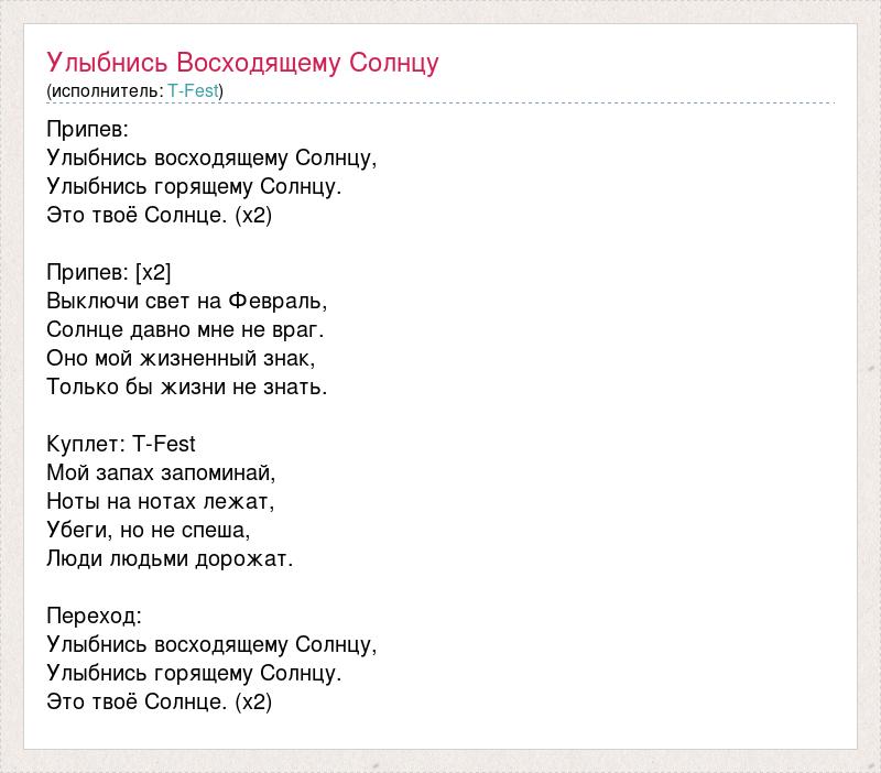 Припев: Улыбнись восходящему Солнцу, Улыбнись горящему Солнцу. Это твоё Солнце. (x2) Припев: [x2] Выключи свет на Февраль, Солнце давно мне не враг. Оно мой жизненный знак, Только бы жизни не знать. Куплет: T-Fest Мой запах запоминай, Ноты на нотах лежат, Убеги, но не спеша, Люди людьми дорожат. Переход: Улыбнись восходящему Солнцу, Улыбнись горящему Солнцу. Это твоё Солнце. (x2)