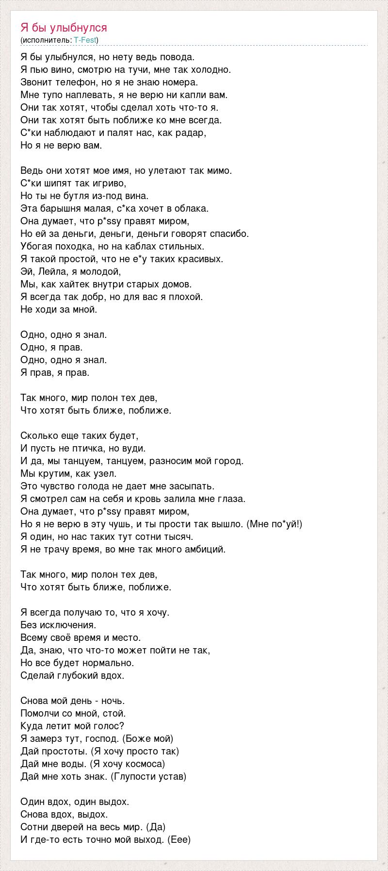 Я бы улыбнулся, но нету ведь повода. Я пью вино, смотрю на тучи, мне так холодно. Звонит телефон, но я не знаю номера. Мне тупо наплевать, я не верю ни капли вам. Они так хотят, чтобы сделал хоть что-то я. Они так хотят быть поближе ко мне всегда. С*ки наблюдают и палят нас, как радар, Но я не верю вам. Ведь они хотят мое имя, но улетают так мимо. С*ки шипят так игриво, Но ты не бутля из-под вина. Эта барышня малая, с*ка хочет в облака. Она думает, что p*ssy правят миром, Но ей за деньги, деньги, деньги говорят спасибо. Убогая походка, но на каблах стильных. Я такой простой, что не е*у таких красивых. Эй, Лейла, я молодой, Мы, как хайтек внутри старых домов. Я всегда так добр, но для вас я плохой. Не ходи за мной. Одно, одно я знал. Одно, я прав. Одно, одно я знал. Я прав, я прав. Так много, мир полон тех дев, Что хотят быть ближе, поближе. Сколько еще таких будет, И пусть не птичка, но вуди. И да, мы танцуем, танцуем, разносим мой город. Мы крутим, как узел. Это чувство голода не дает мне засыпать. Я смотрел сам на себя и кровь залила мне глаза. Она думает, что p*ssy правят миром, Но я не верю в эту чушь, и ты прости так вышло. (Мне по*уй!) Я один, но нас таких тут сотни тысяч. Я не трачу время, во мне так много амбиций. Так много, мир полон тех дев, Что хотят быть ближе, поближе. Я всегда получаю то, что я хочу. Без исключения. Всему своё время и место. Да, знаю, что что-то может пойти не так, Но все будет нормально. Сделай глубокий вдох. Снова мой день - ночь. Помолчи со мной, стой. Куда летит мой голос? Я замерз тут, господ. (Боже мой) Дай простоты. (Я хочу просто так) Дай мне воды. (Я хочу космоса) Дай мне хоть знак. (Глупости устав) Один вдох, один выдох. Снова вдох, выдох. Сотни дверей на весь мир. (Да) И где-то есть точно мой выход. (Еее)