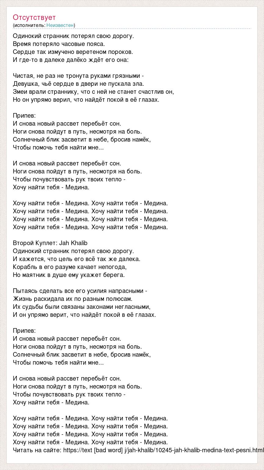 Одинокий странник потерял свою дорогу. Время потеряло часовые пояса. Сердце так измучено веретеном пороков. И где-то в далеке далёко ждёт его она: Чистая, не раз не тронута руками грязными - Девушка, чьё сердце в двери не пускала зла. Змеи врали страннику, что с ней не станет счастлив он, Но он упрямо верил, что найдёт покой в её глазах. Припев: И снова новый рассвет перебьёт сон. Ноги снова пойдут в путь, несмотря на боль. Солнечный блик засветит в небе, бросив намёк, Чтобы помочь тебя найти мне... И снова новый рассвет перебьёт сон. Ноги снова пойдут в путь, несмотря на боль. Чтобы почувствовать рук твоих тепло - Хочу найти тебя - Медина. Хочу найти тебя - Медина. Хочу найти тебя - Медина. Хочу найти тебя - Медина. Хочу найти тебя - Медина. Хочу найти тебя - Медина. Хочу найти тебя - Медина. Хочу найти тебя - Медина. Хочу найти тебя - Медина. Второй Куплет: Jah Khalib Одинокий странник потерял свою дорогу. И кажется, что цель его всё так же далека. Корабль в его разуме качает непогода, Но маятник в душе ему укажет берега. Пытаясь сделать все его усилия напрасными - Жизнь раскидала их по разным полюсам. Их судьбы были связаны законами негласными, И он упрямо верит, что найдёт покой в её глазах. Припев: И снова новый рассвет перебьёт сон. Ноги снова пойдут в путь, несмотря на боль. Солнечный блик засветит в небе, бросив намёк, Чтобы помочь тебя найти мне... И снова новый рассвет перебьёт сон. Ноги снова пойдут в путь, несмотря на боль. Чтобы почувствовать рук твоих тепло - Хочу найти тебя - Медина. Хочу найти тебя - Медина. Хочу найти тебя - Медина. Хочу найти тебя - Медина. Хочу найти тебя - Медина. Хочу найти тебя - Медина. Хочу найти тебя - Медина. Хочу найти тебя - Медина. Хочу найти тебя - Медина. Читать на сайте: https://text [bad word] j/jah-khalib/10245-jah-khalib-medina-text-pesni.html