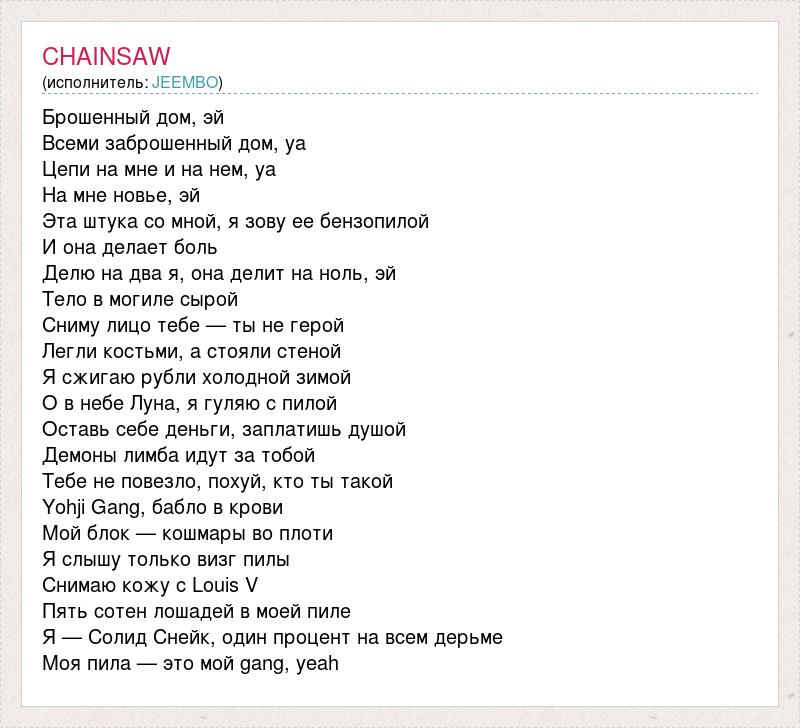 Брошенный дом, эй Всеми заброшенный дом, ya Цепи на мне и на нем, ya На мне новье, эй Эта штука со мной, я зову ее бензопилой И она делает боль Делю на два я, она делит на ноль, эй Тело в могиле сырой Сниму лицо тебе — ты не герой Легли костьми, а стояли стеной Я сжигаю рубли холодной зимой О в небе Луна, я гуляю с пилой Оставь себе деньги, заплатишь душой Демоны лимба идут за тобой Тебе не повезло, похуй, кто ты такой Yohji Gang, бабло в крови Мой блок — кошмары во плоти Я слышу только визг пилы Снимаю кожу с Louis V Пять сотен лошадей в моей пиле Я — Солид Снейк, один процент на всем дерьме Моя пила — это мой gang, yeah