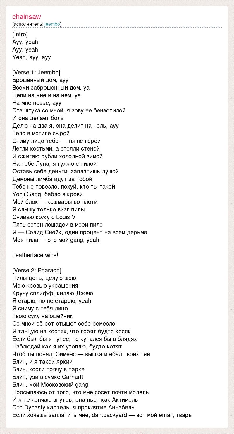 [Intro] Ayy, yeah Ayy, yeah Yeah, ayy, ayy [Verse 1: Jeembo] Брошенный дом, ayy Всеми заброшенный дом, ya Цепи на мне и на нем, ya На мне новье, ayy Эта штука со мной, я зову ее бензопилой И она делает боль Делю на два я, она делит на ноль, ayy Тело в могиле сырой Сниму лицо тебе — ты не герой Легли костьми, а стояли стеной Я сжигаю рубли холодной зимой На небе Луна, я гуляю с пилой Оставь себе деньги, заплатишь душой Демоны лимба идут за тобой Тебе не повезло, похуй, кто ты такой Yohji Gang, бабло в крови Мой блок — кошмары во плоти Я слышу только визг пилы Снимаю кожу с Louis V Пять сотен лошадей в моей пиле Я — Солид Снейк, один процент на всем дерьме Моя пила — это мой gang, yeah Leatherface wins! [Verse 2: Pharaoh] Пилы цепь, целую шею Мою кровью украшения Кручу сплифф, кидаю Джею Я старю, но не старею, yeah Я сниму с тебя лицо Твою суку на ошейник Со мной её рот отыщет себе ремесло Я танцую на костях, что горят будто косяк Если был бы я тупее, то купался бы в блядях Наблюдай как я их утоплю, будто котят Чтоб ты понял, Сименс — вышка и ебал твоих тян Блин, и я такой яркий Блин, кости прячу в парке Блин, узи в сумке Carhartt Блин, мой Московский gang Просыпаюсь от того, что мне сосет почти модель И я не кончаю внутрь, она пьет как Актимель Это Dynasty картель, я проклятие Аннабель Если хочешь заплатить мне, dan.backyard — вот мой email, тварь