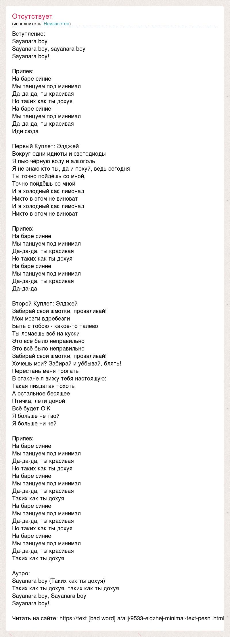 Вступление: Sayanara boy Sayanara boy, sayanara boy Sayanara boy! Припев: На баре синие Мы танцуем под минимал Да-да-да, ты красивая Но таких как ты дохуя На баре синие Мы танцуем под минимал Да-да-да, ты красивая Иди сюда Первый Куплет: Элджей Вокруг одни идиоты и светодиоды Я пью чёрную воду и алкоголь Я не знаю кто ты, да и похуй, ведь сегодня Ты точно пойдёшь со мной, Точно пойдёшь со мной И я холодный как лимонад Никто в этом не виноват И я холодный как лимонад Никто в этом не виноват Припев: На баре синие Мы танцуем под минимал Да-да-да, ты красивая Но таких как ты дохуя На баре синие Мы танцуем под минимал Да-да-да, ты красивая Да-да-да Второй Куплет: Элджей Забирай свои шмотки, проваливай! Мои мозги вдребезги Быть с тобою - какое-то палево Ты ломаешь всё на куски Это всё было неправильно Это всё было неправильно Забирай свои шмотки, проваливай! Хочешь мои? Забирай и уёбывай, блять! Перестань меня трогать В стакане я вижу тебя настоящую: Такая пиздатая похоть А остальное бесящее Птичка, лети домой Всё будет O'K Я больше не твой Я больше ни чей Припев: На баре синие Мы танцуем под минимал Да-да-да, ты красивая Но таких как ты дохуя На баре синие Мы танцуем под минимал Да-да-да, ты красивая Таких как ты дохуя На баре синие Мы танцуем под минимал Да-да-да, ты красивая Но таких как ты дохуя На баре синие Мы танцуем под минимал Да-да-да, ты красивая Таких как ты дохуя Аутро: Sayanara boy (Таких как ты дохуя) Таких как ты дохуя, таких как ты дохуя Sayanara boy, Sayanara boy Sayanara boy! Читать на сайте: https://text [bad word] a/allj/9533-eldzhej-minimal-text-pesni.html