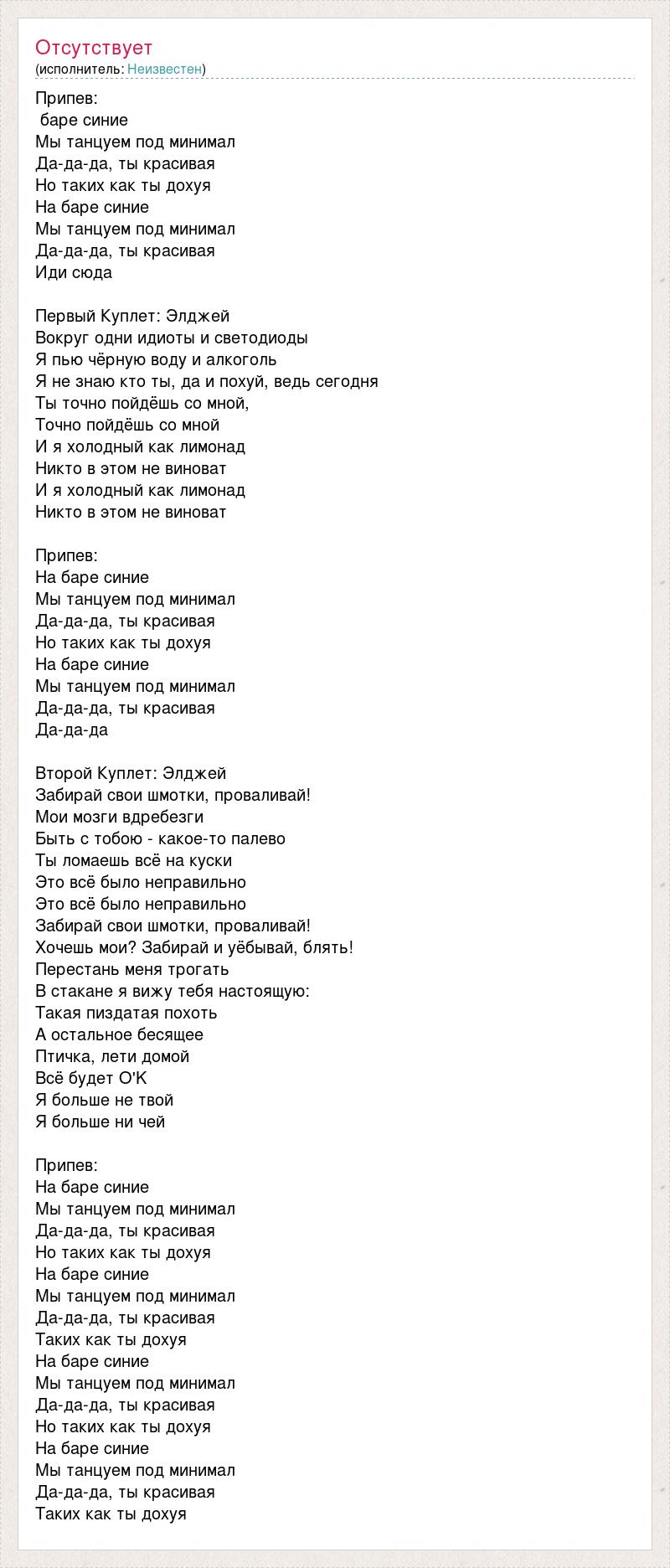 Припев: баре синие Мы танцуем под минимал Да-да-да, ты красивая Но таких как ты дохуя На баре синие Мы танцуем под минимал Да-да-да, ты красивая Иди сюда Первый Куплет: Элджей Вокруг одни идиоты и светодиоды Я пью чёрную воду и алкоголь Я не знаю кто ты, да и похуй, ведь сегодня Ты точно пойдёшь со мной, Точно пойдёшь со мной И я холодный как лимонад Никто в этом не виноват И я холодный как лимонад Никто в этом не виноват Припев: На баре синие Мы танцуем под минимал Да-да-да, ты красивая Но таких как ты дохуя На баре синие Мы танцуем под минимал Да-да-да, ты красивая Да-да-да Второй Куплет: Элджей Забирай свои шмотки, проваливай! Мои мозги вдребезги Быть с тобою - какое-то палево Ты ломаешь всё на куски Это всё было неправильно Это всё было неправильно Забирай свои шмотки, проваливай! Хочешь мои? Забирай и уёбывай, блять! Перестань меня трогать В стакане я вижу тебя настоящую: Такая пиздатая похоть А остальное бесящее Птичка, лети домой Всё будет O'K Я больше не твой Я больше ни чей Припев: На баре синие Мы танцуем под минимал Да-да-да, ты красивая Но таких как ты дохуя На баре синие Мы танцуем под минимал Да-да-да, ты красивая Таких как ты дохуя На баре синие Мы танцуем под минимал Да-да-да, ты красивая Но таких как ты дохуя На баре синие Мы танцуем под минимал Да-да-да, ты красивая Таких как ты дохуя
