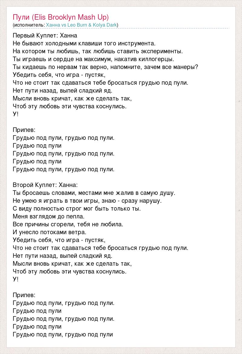Первый Куплет: Ханна Не бывают холодными клавиши того инструмента. На котором ты любишь, так любишь ставить эксперименты. Ты играешь и сердце на максимум, накатив киллогерцы. Ты кидаешь по нервам так верно, напомните, зачем все манеры? Убедить себя, что игра - пустяк, Что не стоит так сдаваться тебе бросаться грудью под пули. Нет пути назад, выпей сладкий яд. Мысли вновь кричат, как же сделать так, Чтоб эту любовь эти чувства коснулись. У! Припев: Грудью под пули, грудью под пули. Грудью под пули Грудью под пули, грудью под пули. Грудью под пули Грудью под пули, грудью под пули. Второй Куплет: Ханна: Ты бросаешь словами, местами мне жалив в самую душу. Не умею я играть в твои игры, знаю - сразу нарушу. С виду полностью строг мог быть только ты. Меня взглядом до пепла. Все причины сгорели, тебя не любила. И унесло потоками ветра. Убедить себя, что игра - пустяк, Что не стоит так сдаваться тебе бросаться грудью под пули. Нет пути назад, выпей сладкий яд. Мысли вновь кричат, как же сделать так, Чтоб эту любовь эти чувства коснулись. У! Припев: Грудью под пули, грудью под пули. Грудью под пули Грудью под пули, грудью под пули. Грудью под пули Грудью под пули, грудью под пули