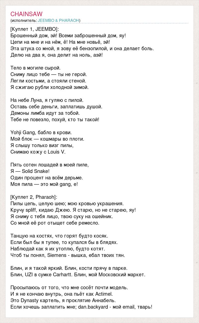 [Куплет 1, JEEMBO]: Брошенный дом, эй! Всеми заброшенный дом, яу! Цепи на мне и на нём, ё! На мне новьё, эй! Эта штука со мной, я зову её бензопилой, и она делает боль. Делю на два я, она делит на ноль, aэй! Тело в могиле сырой. Сниму лицо тебе — ты не герой. Легли костьми, а стояли стеной. Я сжигаю рубли холодной зимой. На небе Луна, я гуляю с пилой. Оставь себе деньги, заплатишь душой. Демоны лимба идут за тобой. Тебе не повезло, похуй, кто ты такой! Yohji Gang, бабло в крови. Мой блок — кошмары во плоти. Я слышу только визг пилы, Снимаю кожу с Louis V. Пять сотен лошадей в моей пиле, Я — Solid Snake! Один процент на всём дерьме. Моя пила — это мой gang, е! [Куплет 2, Pharaoh]: Пилы цепь, целую шею; мою кровью украшения. Кручу spliff, кидаю Джею. Я старю, но не старею, яу! Я сниму с тебя лицо, твою суку на ошейник. Со мной её рот отыщет себе ремесло. Танцую на костях, что горят будто косяк. Если был бы я тупее, то купался бы в блядях. Наблюдай как я их утоплю, будто котят. Чтоб ты понял, Siemens - вышка, ебал твоих тян. Блин, и я такой яркий. Блин, кости прячу в парке. Блин, UZI в сумке Carhartt. Блин, мой Московский маркет. Просыпаюсь от того, что мне сосёт почти модель. И я не кончаю внутрь, она пьёт как Actimel. Это Dynasty картель, я проклятие Аннабель. Если хочешь заплатить мне; dan.backyard - мой email, тварь!