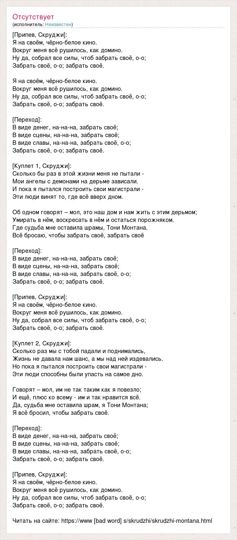[Припев, Скруджи]: Я на своём, чёрно-белое кино. Вокруг меня всё рушилось, как домино. Ну да, собрал все силы, чтоб забрать своё, о-о; Забрать своё, о-о; забрать своё. Я на своём, чёрно-белое кино. Вокруг меня всё рушилось, как домино. Ну да, собрал все силы, чтоб забрать своё, о-о; Забрать своё, о-о; забрать своё. [Переход]: В виде денег, на-на-на, забрать своё; В виде сцены, на-на-на, забрать своё; В виде славы, на-на-на, забрать своё, о-о; Забрать своё, о-о; забрать своё. [Куплет 1, Скруджи]: Сколько бы раз в этой жизни меня не пытали - Мои ангелы с демонами на дерьме зависали. И пока я пытался построить свои магистрали - Эти люди винят то, где всё вверх дном. Об одном говорят – мол, это наш дом и нам жить с этим дерьмом; Умирать в нём, воскресать в нём и остаться порожняком. Где судьба мне оставила шрамы, Тони Монтана. Всё бросаю, чтобы забрать своё, забрать своё [Переход]: В виде денег, на-на-на, забрать своё; В виде сцены, на-на-на, забрать своё; В виде славы, на-на-на, забрать своё, о-о; Забрать своё, о-о; забрать своё. [Припев, Скруджи]: Я на своём, чёрно-белое кино. Вокруг меня всё рушилось, как домино. Ну да, собрал все силы, чтоб забрать своё, о-о; Забрать своё, о-о; забрать своё. [Куплет 2, Скруджи]: Сколько раз мы с тобой падали и поднимались, Жизнь не давала нам шанс, а мы над ней издевались. Но пока я пытался построить свои магистрали - Эти люди способны были упасть на самое дно. Говорят – мол, им не так таким как я повезло; И ещё, плюс ко всему - им и так нравится всё. Да, судьба мне оставила шрам, я Тони Монтана; Я всё бросил, чтобы забрать своё. [Переход]: В виде денег, на-на-на, забрать своё; В виде сцены, на-на-на, забрать своё; В виде славы, на-на-на, забрать своё, о-о; Забрать своё, о-о; забрать своё. [Припев, Скруджи]: Я на своём, чёрно-белое кино. Вокруг меня всё рушилось, как домино. Ну да, собрал все силы, чтоб забрать своё, о-о; Забрать своё, о-о; забрать своё. Читать на сайте: https://www [bad word] s/skrudzhi/skrudzhi-montana.html