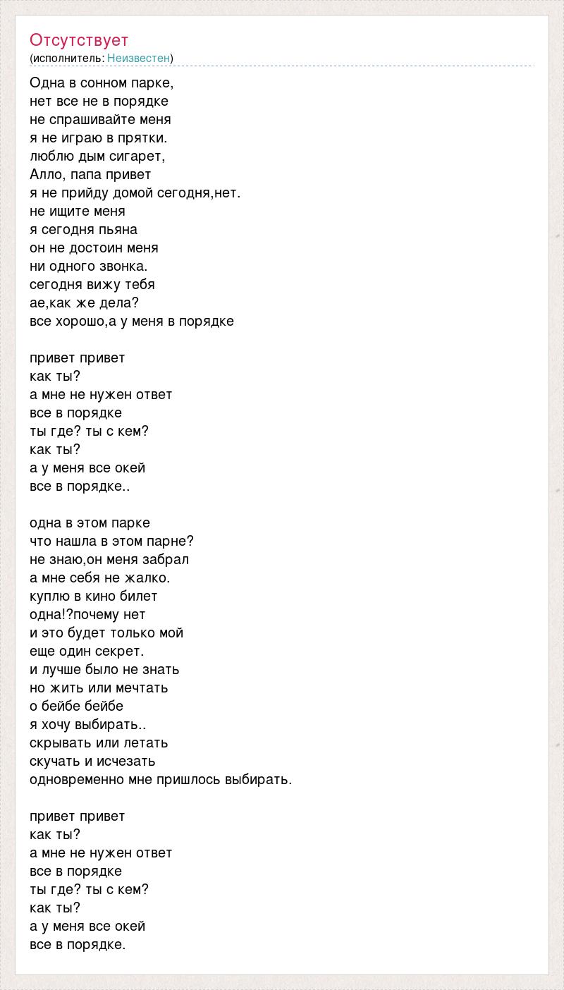 Одна в сонном парке, нет все не в порядке не спрашивайте меня я не играю в прятки. люблю дым сигарет, Алло, папа привет я не прийду домой сегодня,нет. не ищите меня я сегодня пьяна он не достоин меня ни одного звонка. сегодня вижу тебя ае,как же дела? все хорошо,а у меня в порядке привет привет как ты? а мне не нужен ответ все в порядке ты где? ты с кем? как ты? а у меня все окей все в порядке.. одна в этом парке что нашла в этом парне? не знаю,он меня забрал а мне себя не жалко. куплю в кино билет одна!?почему нет и это будет только мой еще один секрет. и лучше было не знать но жить или мечтать о бейбе бейбе я хочу выбирать.. скрывать или летать скучать и исчезать одновременно мне пришлось выбирать. привет привет как ты? а мне не нужен ответ все в порядке ты где? ты с кем? как ты? а у меня все окей все в порядке.