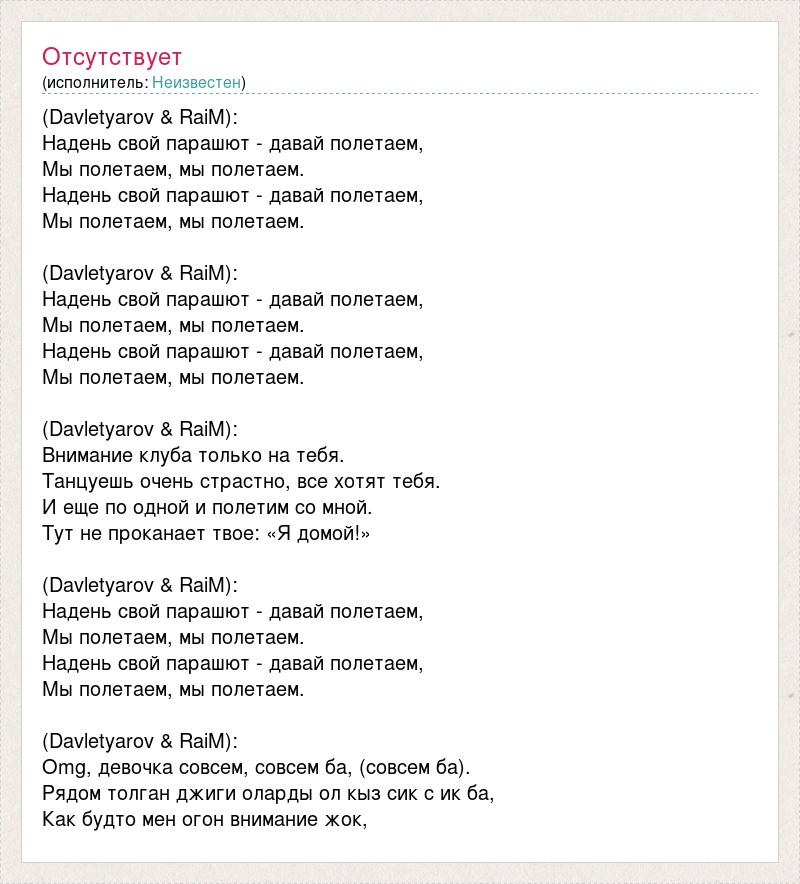 (Davletyarov & RaiM): Надень свой парашют - давай полетаем, Мы полетаем, мы полетаем. Надень свой парашют - давай полетаем, Мы полетаем, мы полетаем. (Davletyarov & RaiM): Надень свой парашют - давай полетаем, Мы полетаем, мы полетаем. Надень свой парашют - давай полетаем, Мы полетаем, мы полетаем. (Davletyarov & RaiM): Внимание клуба только на тебя. Танцуешь очень страстно, все хотят тебя. И еще по одной и полетим со мной. Тут не проканает твое: «Я домой!» (Davletyarov & RaiM): Надень свой парашют - давай полетаем, Мы полетаем, мы полетаем. Надень свой парашют - давай полетаем, Мы полетаем, мы полетаем. (Davletyarov & RaiM): Оmg, девочка совсем, совсем ба, (совсем ба). Рядом толган джиги оларды ол кыз сик с ик ба, Как будто мен огон внимание жок,