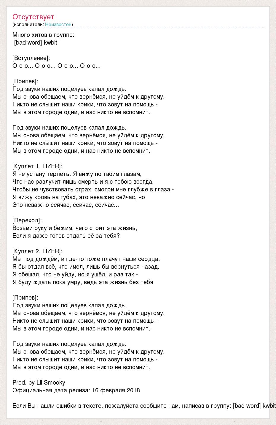 Много хитов в группе: [bad word] kwbit [Вступление]: О-о-о... О-о-о... О-о-о... О-о-о... [Припев]: Под звуки наших поцелуев капал дождь. Мы снова обещаем, что вернёмся, не уйдём к другому. Никто не слышит наши крики, что зовут на помощь - Мы в этом городе одни, и нас никто не вспомнит. Под звуки наших поцелуев капал дождь. Мы снова обещаем, что вернёмся, не уйдём к другому. Никто не слышит наши крики, что зовут на помощь - Мы в этом городе одни, и нас никто не вспомнит. [Куплет 1, LIZER]: Я не устану терпеть. Я вижу по твоим глазам, Что нас разлучит лишь смерть и я с тобою всегда. Чтобы не чувствовать страх, смотри мне глубже в глаза - Я вижу кровь на губах, это неважно сейчас, но Это неважно сейчас, сейчас, сейчас... [Переход]: Возьми руку и бежим, чего стоит эта жизнь, Если я даже готов отдать её за тебя? [Куплет 2, LIZER]: Мы под дождём, и где-то тоже плачут наши сердца. Я бы отдал всё, что имел, лишь бы вернуться назад. Я обещал, что не уйду, но я ушёл, и раз так - Я буду ждать пока умру, ведь эта жизнь без тебя [Припев]: Под звуки наших поцелуев капал дождь. Мы снова обещаем, что вернёмся, не уйдём к другому. Никто не слышит наши крики, что зовут на помощь - Мы в этом городе одни, и нас никто не вспомнит. Под звуки наших поцелуев капал дождь. Мы снова обещаем, что вернёмся, не уйдём к другому. Никто не слышит наши крики, что зовут на помощь - Мы в этом городе одни, и нас никто не вспомнит. Prod. by Lil Smooky Официальная дата релиза: 16 февраля 2018 Если Вы нашли ошибки в тексте, пожалуйста сообщите нам, написав в группу: [bad word] kwbit