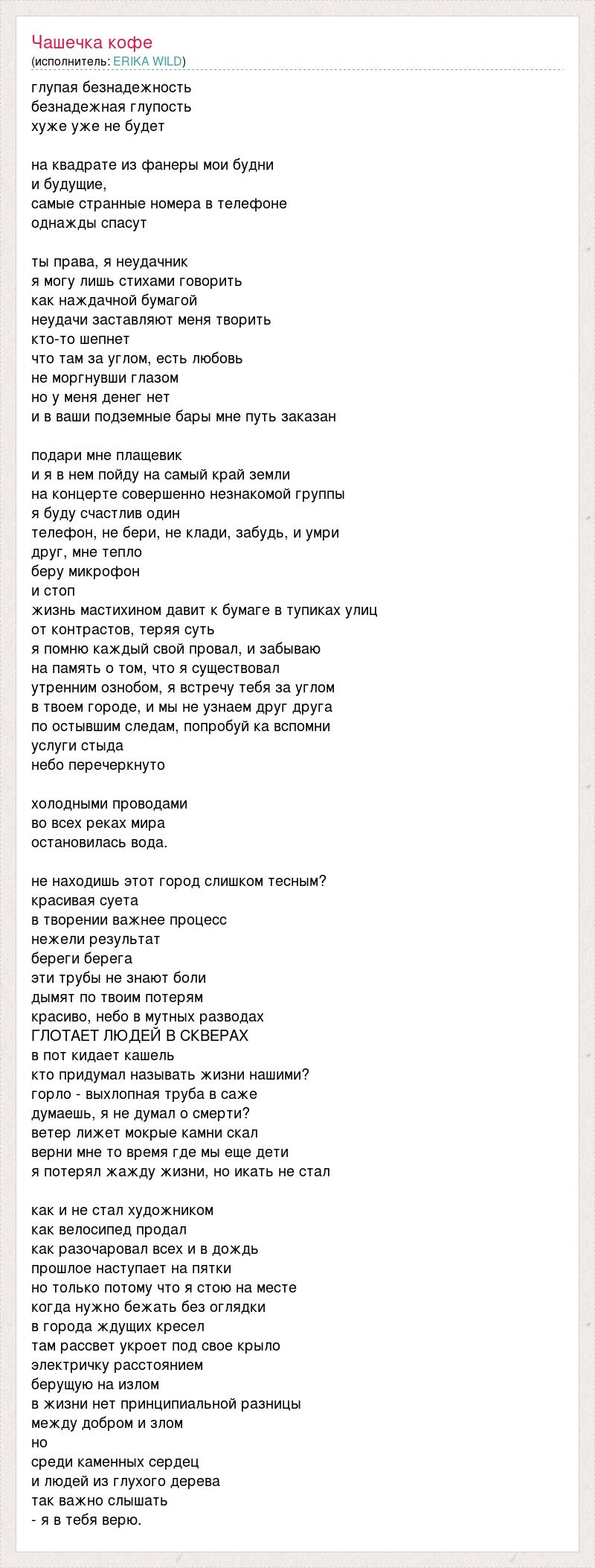 глупая безнадежность безнадежная глупость хуже уже не будет на квадрате из фанеры мои будни и будущие, самые странные номера в телефоне однажды спасут ты права, я неудачник я могу лишь стихами говорить как наждачной бумагой неудачи заставляют меня творить кто-то шепнет что там за углом, есть любовь не моргнувши глазом но у меня денег нет и в ваши подземные бары мне путь заказан подари мне плащевик и я в нем пойду на самый край земли на концерте совершенно незнакомой группы я буду счастлив один телефон, не бери, не клади, забудь, и умри друг, мне тепло беру микрофон и стоп жизнь мастихином давит к бумаге в тупиках улиц от контрастов, теряя суть я помню каждый свой провал, и забываю на память о том, что я существовал утренним ознобом, я встречу тебя за углом в твоем городе, и мы не узнаем друг друга по остывшим следам, попробуй ка вспомни услуги стыда небо перечеркнуто холодными проводами во всех реках мира остановилась вода. не находишь этот город слишком тесным? красивая суета в творении важнее процесс нежели результат береги берега эти трубы не знают боли дымят по твоим потерям красиво, небо в мутных разводах ГЛОТАЕТ ЛЮДЕЙ В СКВЕРАХ в пот кидает кашель кто придумал называть жизни нашими? горло - выхлопная труба в саже думаешь, я не думал о смерти? ветер лижет мокрые камни скал верни мне то время где мы еще дети я потерял жажду жизни, но икать не стал как и не стал художником как велосипед продал как разочаровал всех и в дождь прошлое наступает на пятки но только потому что я стою на месте когда нужно бежать без оглядки в города ждущих кресел там рассвет укроет под свое крыло электричку расстоянием берущую на излом в жизни нет принципиальной разницы между добром и злом но среди каменных сердец и людей из глухого дерева так важно слышать - я в тебя верю.