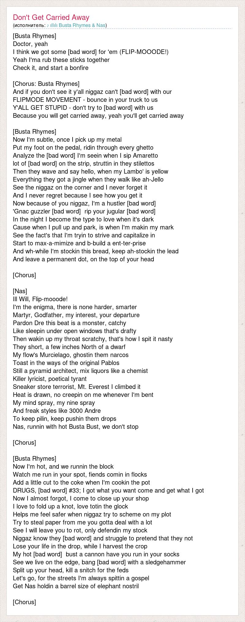 [Busta Rhymes] Doctor, yeah I think we got some [bad word] for 'em (FLIP-MOOODE!) Yeah I'ma rub these sticks together Check it, and start a bonfire [Chorus: Busta Rhymes] And if you don't see it y'all niggaz can't [bad word] with our FLIPMODE MOVEMENT - bounce in your truck to us Y'ALL GET STUPID - don't try to [bad word] with us Because you will get carried away, yeah you'll get carried away [Busta Rhymes] Now I'm subtle, once I pick up my metal Put my foot on the pedal, ridin through every ghetto Analyze the [bad word] I'm seein when I sip Amaretto lot of [bad word] on the strip, struttin in they stilettos Then they wave and say hello, when my Lambo' is yellow Everything they got a jingle when they walk like ah-Jello See the niggaz on the corner and I never forget it And I never regret because I see how you get it Now because of you niggaz, I'm a hustler [bad word] 'Gnac guzzler [bad word] rip your jugular [bad word] In the night I become the type to love when it's dark Cause when I pull up and park, is when I'm makin my mark See the fact's that I'm tryin to strive and capitalize in Start to max-a-mimize and b-build a ent-ter-prise And wh-while I'm stockin this bread, keep ah-stockin the lead And leave a permanent dot, on the top of your head [Chorus] [Nas] Ill Will, Flip-mooode! I'm the enigma, there is none harder, smarter Martyr, Godfather, my interest, your departure Pardon Dre this beat is a monster, catchy Like sleepin under open windows that's drafty Then wakin up my throat scratchy, that's how I spit it nasty They short, a few inches North of a dwarf My flow's Murcielago, ghostin them narcos Toast in the ways of the original Pablos Still a pyramid architect, mix liquors like a chemist Killer lyricist, poetical tyrant Sneaker store terrorist, Mt. Everest I climbed it Heat is drawn, no creepin on me whenever I'm bent My mind spray, my nine spray And freak styles like 3000 Andre To keep pilin, keep pushin them drops Nas, runnin with hot Busta Bust, we don't stop [Chorus] [Busta Rhymes] Now I'm hot, and we runnin the block Watch me run in your spot, fiends comin in flocks Add a little cut to the coke when I'm cookin the pot DRUGS, [bad word] #33; I got what you want come and get what I got Now I almost forgot, I come to close up your shop I love to fold up a knot, love totin the glock Helps me feel safer when niggaz try to scheme on my plot Try to steal paper from me you gotta deal with a lot See I will leave you to rot, only defendin my stock Niggaz know they [bad word] and struggle to pretend that they not Lose your life in the drop, while I harvest the crop My hot [bad word] bust a cannon have you run in your socks See we live on the edge, bang [bad word] with a sledgehammer Split up your head, kill a snitch for the feds Let's go, for the streets I'm always spittin a gospel Get Nas holdin a barrel size of elephant nostril [Chorus]