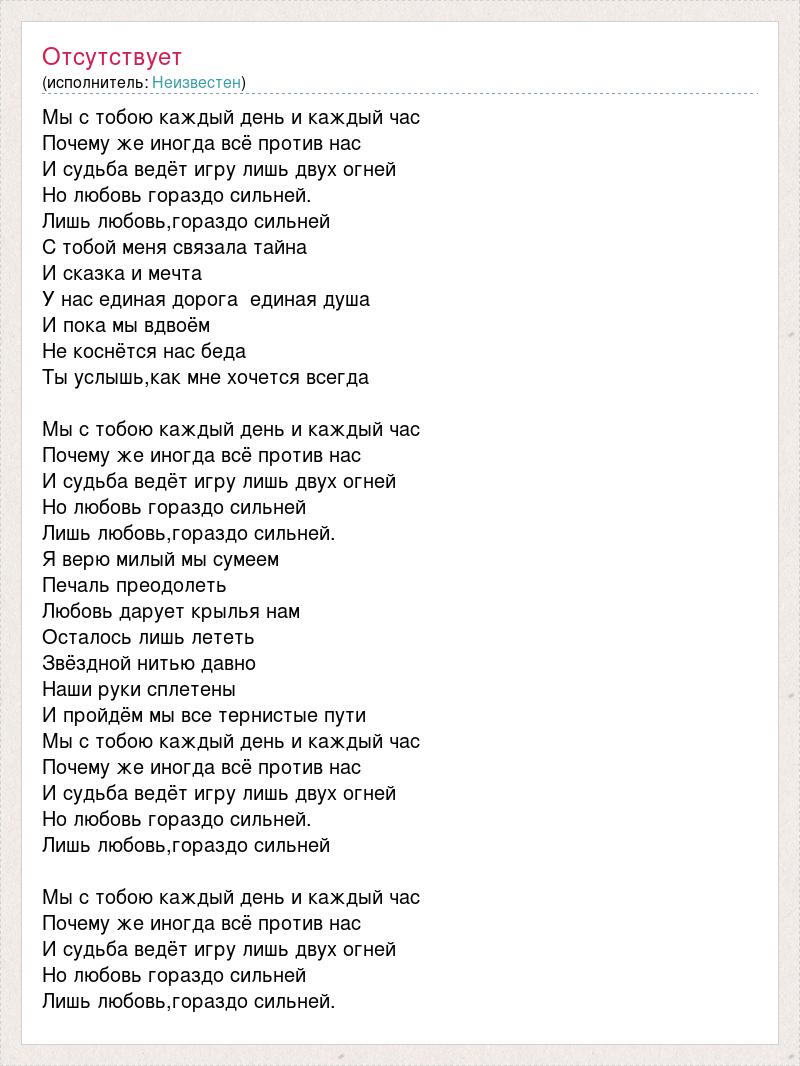 Мы с тобою каждый день и каждый час Почему же иногда всё против нас И судьба ведёт игру лишь двух огней Но любовь гораздо сильней. Лишь любовь,гораздо сильней С тобой меня связала тайна И сказка и мечта У нас единая дорога единая душа И пока мы вдвоём Не коснётся нас беда Ты услышь,как мне хочется всегда Мы с тобою каждый день и каждый час Почему же иногда всё против нас И судьба ведёт игру лишь двух огней Но любовь гораздо сильней Лишь любовь,гораздо сильней. Я верю милый мы сумеем Печаль преодолеть Любовь дарует крылья нам Осталось лишь лететь Звёздной нитью давно Наши руки сплетены И пройдём мы все тернистые пути Мы с тобою каждый день и каждый час Почему же иногда всё против нас И судьба ведёт игру лишь двух огней Но любовь гораздо сильней. Лишь любовь,гораздо сильней Мы с тобою каждый день и каждый час Почему же иногда всё против нас И судьба ведёт игру лишь двух огней Но любовь гораздо сильней Лишь любовь,гораздо сильней.