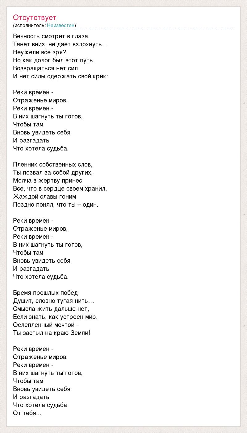 Вечность смотрит в глаза Тянет вниз, не дает вздохнуть… Неужели все зря? Но как долог был этот путь. Возвращаться нет сил, И нет силы сдержать свой крик: Реки времен - Отраженье миров, Реки времен - В них шагнуть ты готов, Чтобы там Вновь увидеть себя И разгадать Что хотела судьба. Пленник собственных слов, Ты позвал за собой других, Молча в жертву принес Все, что в сердце своем хранил. Жаждой славы гоним Поздно понял, что ты – один. Реки времен - Отраженье миров, Реки времен - В них шагнуть ты готов, Чтобы там Вновь увидеть себя И разгадать Что хотела судьба. Бремя прошлых побед Душит, словно тугая нить… Смысла жить дальше нет, Если знать, как устроен мир. Ослепленный мечтой - Ты застыл на краю Земли! Реки времен - Отраженье миров, Реки времен - В них шагнуть ты готов, Чтобы там Вновь увидеть себя И разгадать Что хотела судьба От тебя...