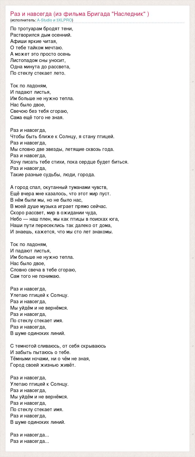 По тротуарам бродят тени, Растворился дым осенний. Афиши яркие читая, О тебе тайком мечтаю. А может это просто осень Листопадом сны уносит, Одна минута до рассвета, По стеклу стекает лето. Ток по ладоням, И падают листья, Им больше не нужно тепла. Нас было двое, Свечою без тебя сгораю, Сама ещё того не зная. Раз и навсегда, Чтобы быть ближе к Солнцу, я стану птицей. Раз и навсегда, Мы словно две звезды, летящие сквозь года. Раз и навсегда, Хочу писать тебе стихи, пока сердце будет биться. Раз и навсегда, Такие разные судьбы, люди, города. А город спал, окутанный туманами чувств, Ещё вчера мне казалось, что этот мир пуст. В нём были мы, но не было нас, В моей душе музыка играет прямо сейчас. Скоро рассвет, мир в ожидании чуда, Небо — наш плен, мы как птицы в поисках юга, Наши пути пересеклись так далеко от дома, И знаешь, кажется, что мы сто лет знакомы. Ток по ладоням, И падают листья, Им больше не нужно тепла. Нас было двое, Словно свеча в тебе сгораю, Сам того не понимаю. Раз и навсегда, Улетаю птицей к Солнцу. Раз и навсегда, Мы уйдём и не вернёмся. Раз и навсегда, По стеклу стекает имя. Раз и навсегда, В шуме одиноких линий. С темнотой сливаюсь, от себя скрываюсь И забыть пытаюсь о тебе. Тёмными ночами, ни о чём не зная, Город своей жизнью живёт. Раз и навсегда, Улетаю птицей к Солнцу. Раз и навсегда, Мы уйдём и не вернёмся. Раз и навсегда, По стеклу стекает имя. Раз и навсегда, В шуме одиноких линий. Раз и навсегда... Раз и навсегда...
