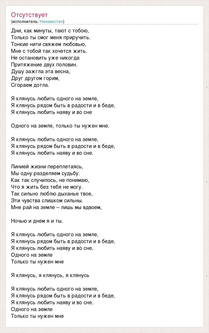 Дни, как минуты, тают с тобою, Только ты смог меня приручить. Тонкие нити свяжем любовью, Мне с тобой так хочется жить. Не остановить уже никогда Притяжение двух половин. Душу зажгла эта весна, Друг другом горим, Сгораем дотла. Я клянусь любить одного на земле, Я клянусь рядом быть в радости и в беде, Я клянусь любить наяву и во сне Одного на земле, только ты нужен мне. Я клянусь любить одного на земле, Я клянусь рядом быть в радости и в беде, Я клянусь любить наяву и во сне. Линией жизни переплетаясь, Мы одну разделяем судьбу. Как так случилось, не понимаю, Что я жить без тебя не могу. Так сильно люблю дыханье твое, Эти чувства слишком сильны. Мне рай на земле – лишь мы вдвоем, Ночью и днем я и ты. Я клянусь любить одного на земле, Я клянусь рядом быть в радости и в беде, Я клянусь любить наяву и во сне. Одного на земле Только ты нужен мне Я клянусь, я клянусь, я клянусь Я клянусь любить одного на земле, Я клянусь рядом быть в радости и в беде, Я клянусь любить наяву и во сне. Одного на земле Только ты нужен мне