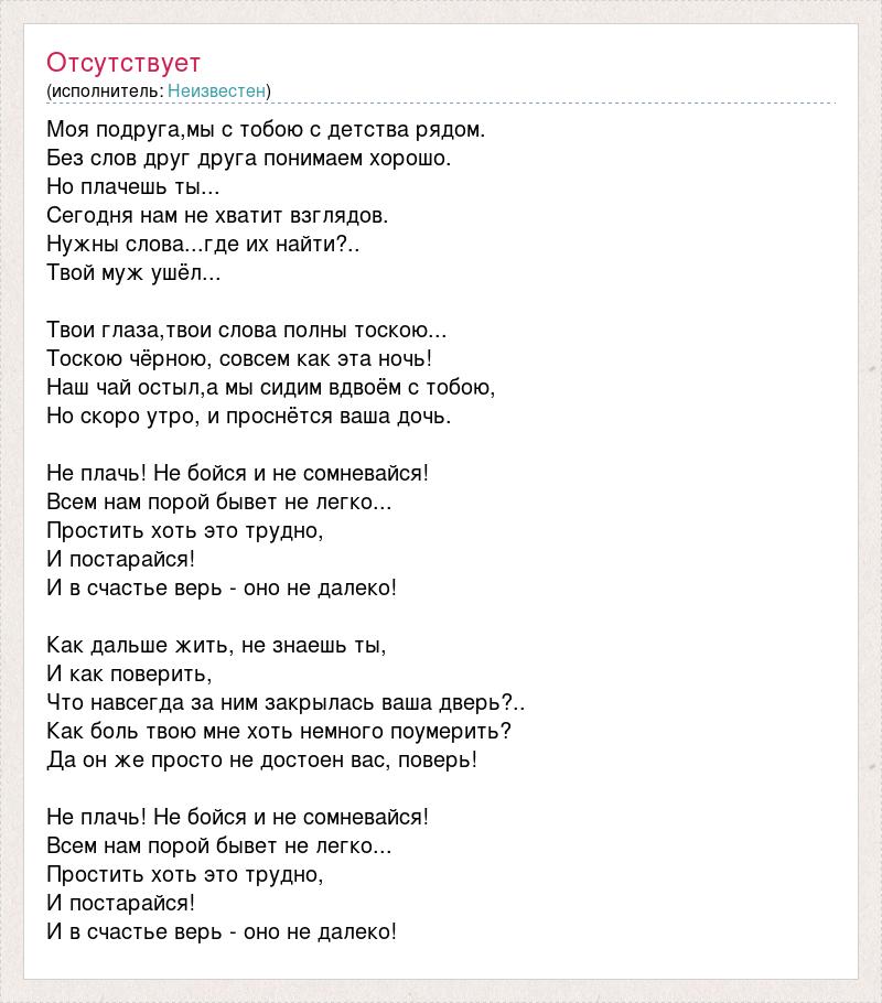 Моя подруга,мы с тобою с детства рядом. Без слов друг друга понимаем хорошо. Но плачешь ты... Сегодня нам не хватит взглядов. Нужны слова...где их найти?.. Твой муж ушёл... Твои глаза,твои слова полны тоскою... Тоскою чёрною, совсем как эта ночь! Наш чай остыл,а мы сидим вдвоём с тобою, Но скоро утро, и проснётся ваша дочь. Не плачь! Не бойся и не сомневайся! Всем нам порой бывет не легко... Простить хоть это трудно, И постарайся! И в счастье верь - оно не далеко! Как дальше жить, не знаешь ты, И как поверить, Что навсегда за ним закрылась ваша дверь?.. Как боль твою мне хоть немного поумерить? Да он же просто не достоен вас, поверь! Не плачь! Не бойся и не сомневайся! Всем нам порой бывет не легко... Простить хоть это трудно, И постарайся! И в счастье верь - оно не далеко!