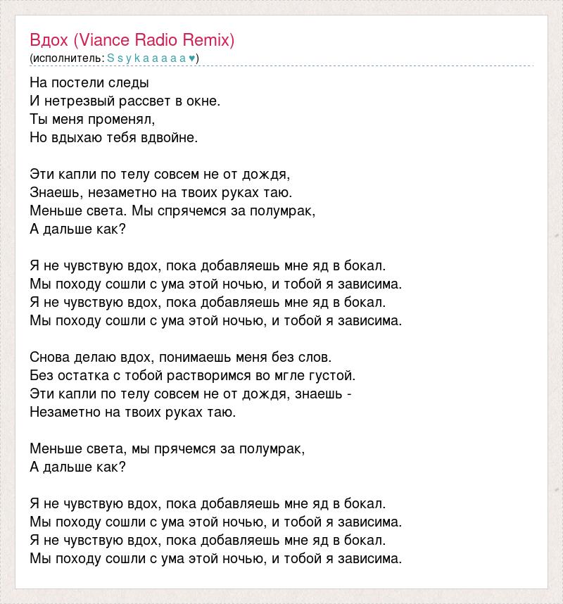 На постели следы И нетрезвый рассвет в окне. Ты меня променял, Но вдыхаю тебя вдвойне. Эти капли по телу совсем не от дождя, Знаешь, незаметно на твоих руках таю. Меньше света. Мы спрячемся за полумрак, А дальше как? Я не чувствую вдох, пока добавляешь мне яд в бокал. Мы походу сошли с ума этой ночью, и тобой я зависима. Я не чувствую вдох, пока добавляешь мне яд в бокал. Мы походу сошли с ума этой ночью, и тобой я зависима. Снова делаю вдох, понимаешь меня без слов. Без остатка с тобой растворимся во мгле густой. Эти капли по телу совсем не от дождя, знаешь - Незаметно на твоих руках таю. Меньше света, мы прячемся за полумрак, А дальше как? Я не чувствую вдох, пока добавляешь мне яд в бокал. Мы походу сошли с ума этой ночью, и тобой я зависима. Я не чувствую вдох, пока добавляешь мне яд в бокал. Мы походу сошли с ума этой ночью, и тобой я зависима.