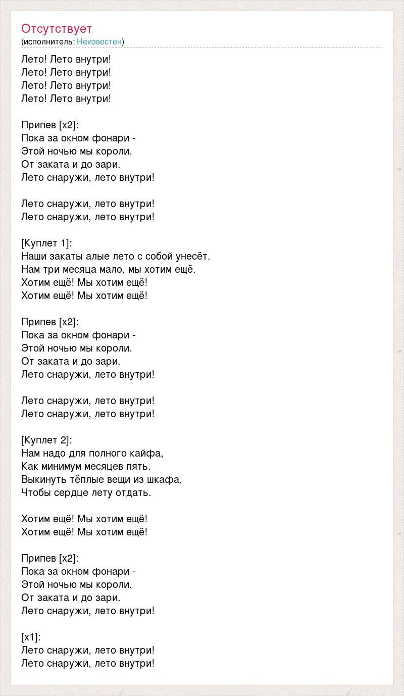 Лето! Лето внутри! Лето! Лето внутри! Лето! Лето внутри! Лето! Лето внутри! Припев [x2]: Пока за окном фонари - Этой ночью мы короли. От заката и до зари. Лето снаружи, лето внутри! Лето снаружи, лето внутри! Лето снаружи, лето внутри! [Куплет 1]: Наши закаты алые лето с собой унесёт. Нам три месяца мало, мы хотим ещё. Хотим ещё! Мы хотим ещё! Хотим ещё! Мы хотим ещё! Припев [x2]: Пока за окном фонари - Этой ночью мы короли. От заката и до зари. Лето снаружи, лето внутри! Лето снаружи, лето внутри! Лето снаружи, лето внутри! [Куплет 2]: Нам надо для полного кайфа, Как минимум месяцев пять. Выкинуть тёплые вещи из шкафа, Чтобы сердце лету отдать. Хотим ещё! Мы хотим ещё! Хотим ещё! Мы хотим ещё! Припев [x2]: Пока за окном фонари - Этой ночью мы короли. От заката и до зари. Лето снаружи, лето внутри! [x1]: Лето снаружи, лето внутри! Лето снаружи, лето внутри!
