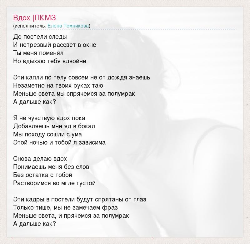 До постели следы И нетрезвый рассвет в окне Ты меня поменял Но вдыхаю тебя вдвойне Эти капли по телу совсем не от дождя знаешь Незаметно на твоих руках таю Меньше света мы спрячемся за полумрак А дальше как? Я не чувствую вдох пока Добавляешь мне яд в бокал Мы походу сошли с ума Этой ночью и тобой я зависима Снова делаю вдох Понимаешь меня без слов Без остатка с тобой Растворимся во мгле густой Эти кадры в постели будут спрятаны от глаз Только тише, мы не замечаем фраз Меньше света, и прячемся за полумрак А дальше как?