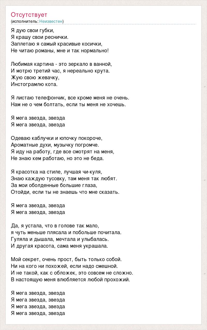 Я дую свои губки, Я крашу свои реснички. Заплетаю я самый красивые косички, Не читаю романы, мне и так нормально! Любимая картина - это зеркало в ванной, И мотрю третий час, я нереально крута. Жую свою жевачку, Инстограмлю кота. Я листаю телефончик, все кроме меня не очень. Нам не о чем болтать, если ты меня не хочешь. Я мега звезда, звезда Я мега звезда, звезда Одеваю каблучки и юпочку покороче, Ароматные духи, музычку погромче. Я иду на работу, где все смотрят на меня, Не знаю кем работаю, но это не беда. Я красотка на стиле, лучшая чи-куля, Знаю каждую тусовку, там меня так любят. За мои оболденные большие глаза, Отойди, если ты не знаешь что мне сказать. Я мега звезда, звезда Я мега звезда, звезда Да, я устала, что в голове так мало, я чуть меньше плясала и побольше почитала. Гуляла и дышала, мечтала и улыбалась. И другая красота, сама меня украшала. Мой секрет, очень прост, быть только собой. Ни на кого ни похожей, если надо смешной. И не такой, как с обложек, это совсем не сложно. В настоящую меня влюбляется любой прохожий. Я мега звезда, звезда Я мега звезда, звезда Я мега звезда, звезда Я мега звезда, звезда