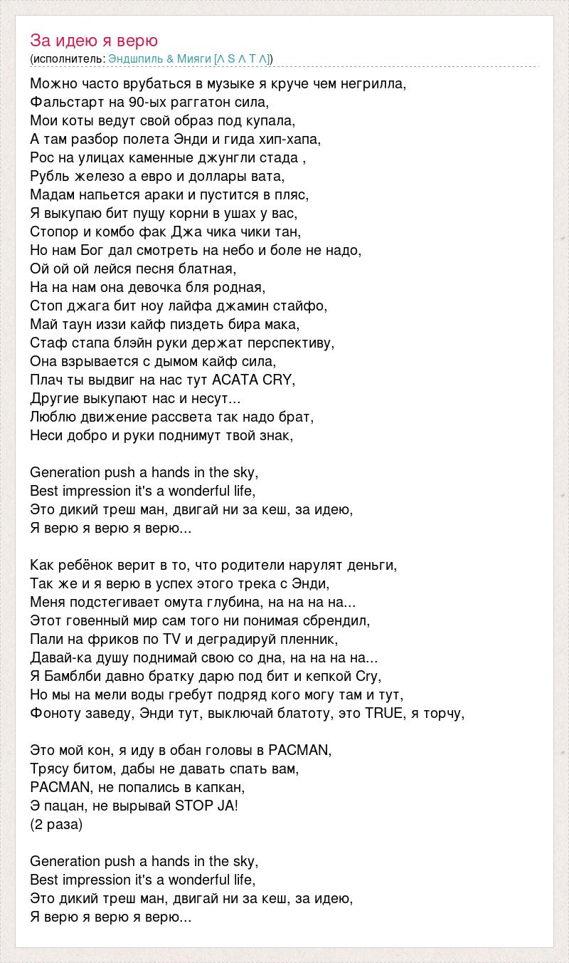 Можно часто врубаться в музыке я круче чем негрилла, Фальстарт на 90-ых раггатон сила, Мои коты ведут свой образ под купала, А там разбор полета Энди и гида хип-хапа, Рос на улицах каменные джунгли стада , Рубль железо а евро и доллары вата, Мадам напьется араки и пустится в пляс, Я выкупаю бит пущу корни в ушах у вас, Стопор и комбо фак Джа чика чики тан, Но нам Бог дал смотреть на небо и боле не надо, Ой ой ой лейся песня блатная, На на нам она девочка бля родная, Стоп джага бит ноу лайфа джамин стайфо, Май таун иззи кайф пиздеть бира мака, Стаф стапа блэйн руки держат перспективу, Она взрывается с дымом кайф сила, Плач ты выдвиг на нас тут АСАТА CRY, Другие выкупают нас и несут... Люблю движение рассвета так надо брат, Неси добро и руки поднимут твой знак, Generation push a hands in the sky, Best impression it's a wonderful life, Это дикий треш ман, двигай ни за кеш, за идею, Я верю я верю я верю... Как ребёнок верит в то, что родители нарулят деньги, Так же и я верю в успех этого трека с Энди, Меня подстегивает омута глубина, на на на на... Этот говенный мир сам того ни понимая сбрендил, Пали на фриков по TV и деградируй пленник, Давай-ка душу поднимай свою со дна, на на на на... Я Бамблби давно братку дарю под бит и кепкой Cry, Но мы на мели воды гребут подряд кого могу там и тут, Фоноту заведу, Энди тут, выключай блатоту, это TRUE, я торчу, Это мой кон, я иду в обан головы в PACMAN, Трясу битом, дабы не давать спать вам, PACMAN, не попались в капкан, Э пацан, не вырывай STOP JA! (2 раза) Generation push a hands in the sky, Best impression it's a wonderful life, Это дикий треш ман, двигай ни за кеш, за идею, Я верю я верю я верю...